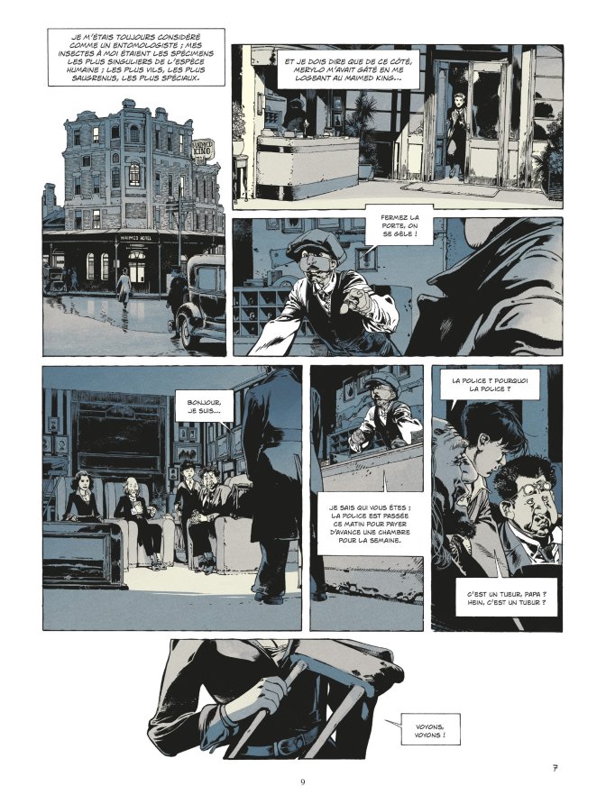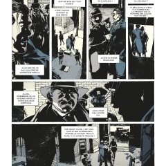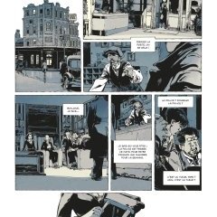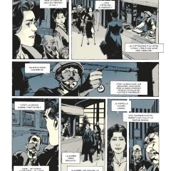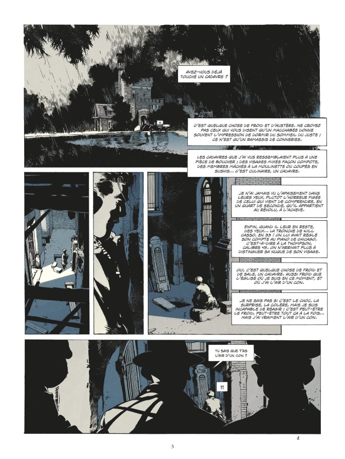 Le dessin d’Hugues Labiano, par son élégance, son sens du détail, mais également par l’expression d’une certaine fragilité, va comme un gant à cette histoire. L’encrage joue avec adresse et force sur le rapport entre les espaces noirs et blancs, évoquant l’éclairage sous-exposé (low-key) de bien des films noirs. Par ce parti pris, le dessin réaliste tire parfois vers l’abstraction. Cela est mis en valeur par le recours à une gamme réduite de couleurs (gris, bleus et, à quelques reprises, rouges). La fin de l’ouvrage, également très sombre, évoque davantage des récits contemporains, notamment Usual Suspects (The Usual Suspects, 1995), le film de Bryan Singer.