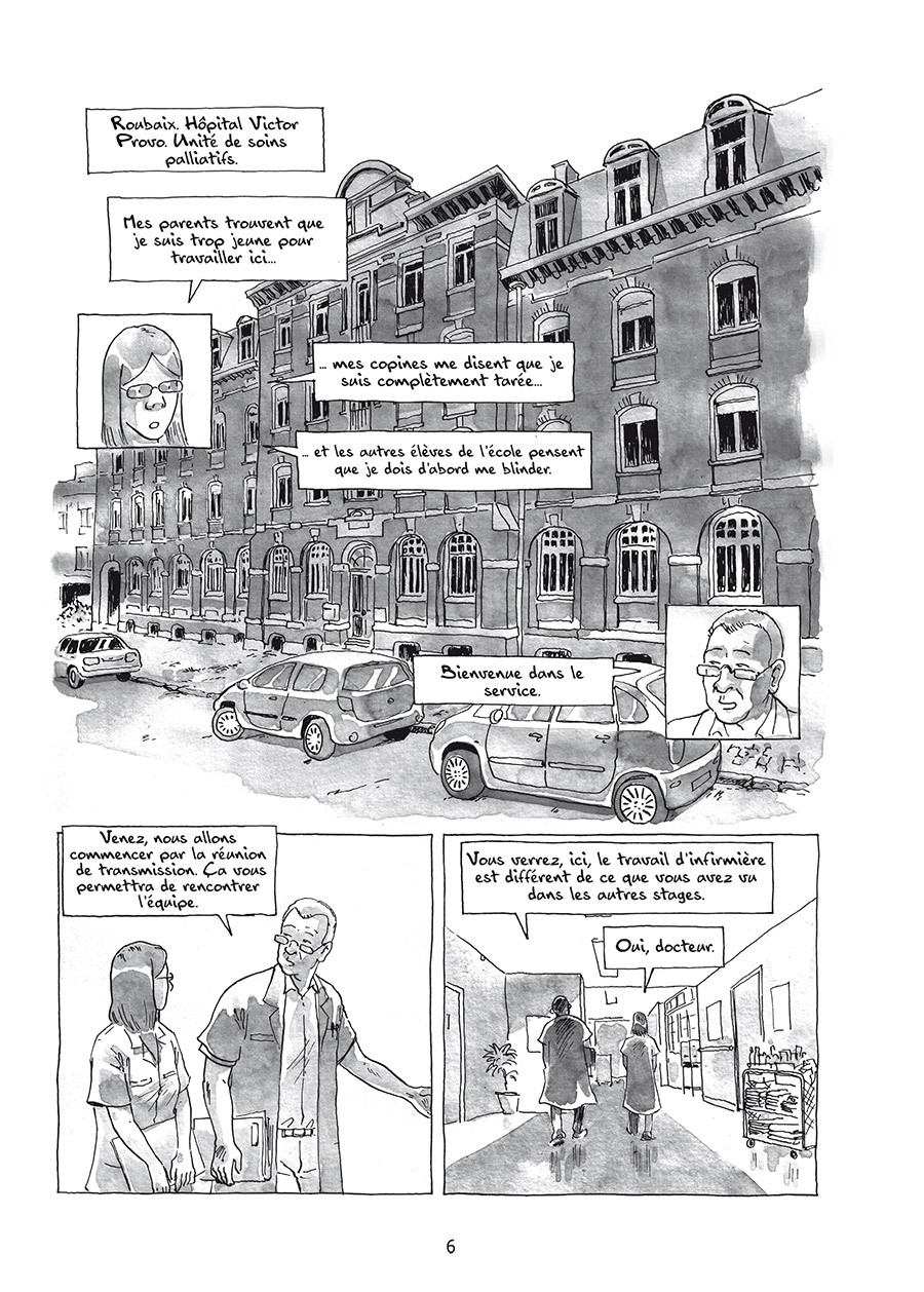 Les témoignages de personnels des hôpitaux commencent à arriver dans le milieu BD (citons par exemple le très réussi et documenté Hôpital Public paru en septembre 2016 chez Vide Cocagne). À la télévision, les séries américaines avaient donné des lettres de noblesse à ce milieu, avec des cartons d’audience et des personnages clefs. Le choix Xavier Betaucourt et Olivier Perret est à des années-lumière de ce qui est proposé dans le monde de la culture, pour évoquer celui de la santé. Quelques jours à vivre ressemble à un récit en pleine immersion dans l’unité de soins palliatifs de l’hôpital de Roubaix, où une infirmière débute sa formation. Mais très vite, les différents personnages glissent de l’un à l’autre, sans fil, sans intrigue, juste pour voguer d’une sensation à une autre, une anecdote en entraînant une autre, une garde de nuit laissant sa place à celle du jour. Entre, des micro-reportages viennent donner une foule d’informations : sur les timides et lentes avancées de la médecine, et de son rapport à l’homme et à la douleur, des pages servant à donner la parole à plusieurs habitués, infirmière, psy ou médecin, qui rapportent leurs impressions et leur humanité ; enfin, des scènes de vie, ou plutôt de fin de vies, rythment le quotidien de l’unité, entre angoisses, acceptations et attentes. Étrangement, le lieu et les pages montent que la mort est le plus souvent paisible, comme une surprise au moment où l’on découvre ces gens qui vivent, travaillent ou s’éteignent, tous traversés par une empathie de l’être humain formidable. Bien sûr, il y a de la colère, du désespoir, mais il est rapidement mis entre parenthèses : ce sont finalement les manques de moyens du service public, les néfastes retours en arrière historiques, les conditions de vie des plus indigents qui révoltent le plus en lisant cet ouvrage, qui peut rapidement faire monter les larmes aux yeux sans que l’on s’en rende compte.