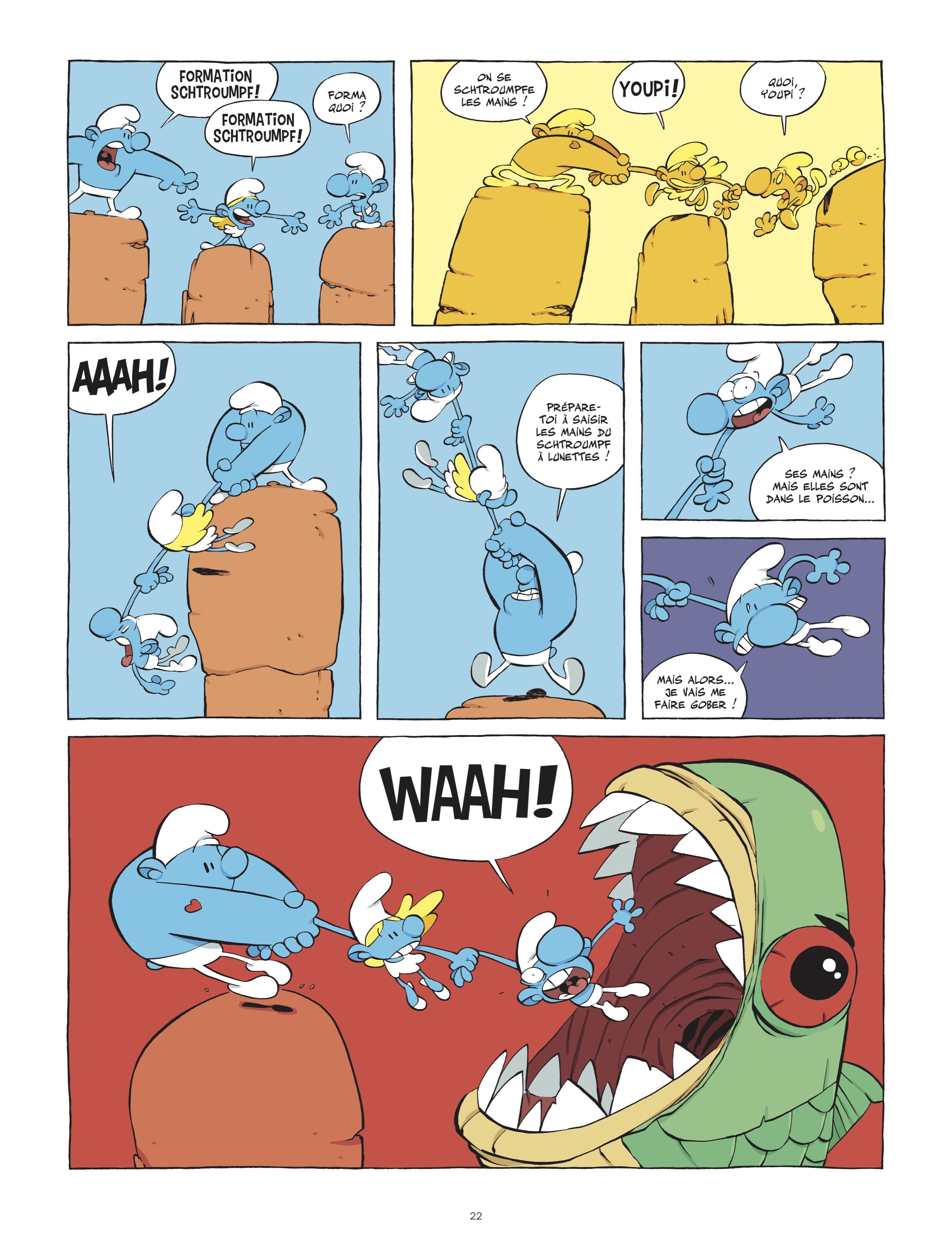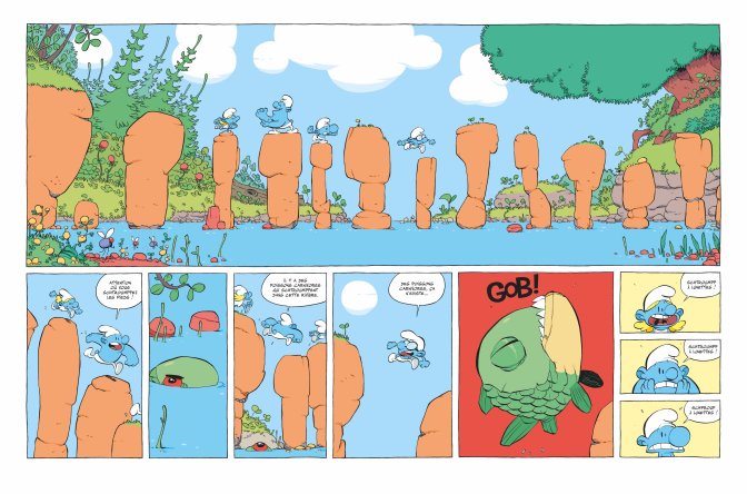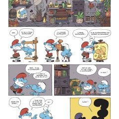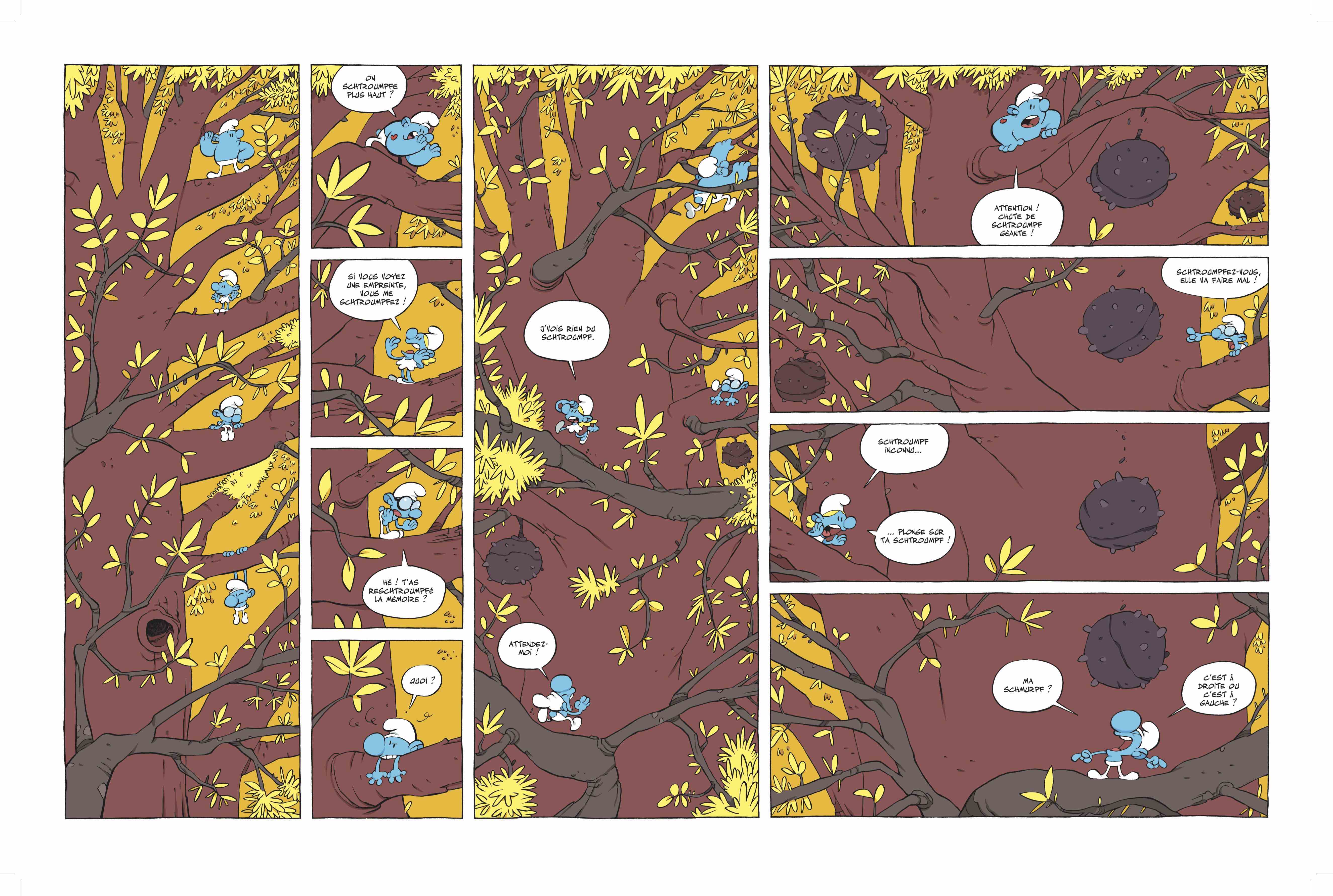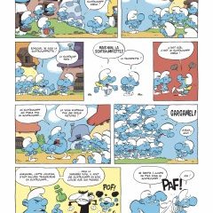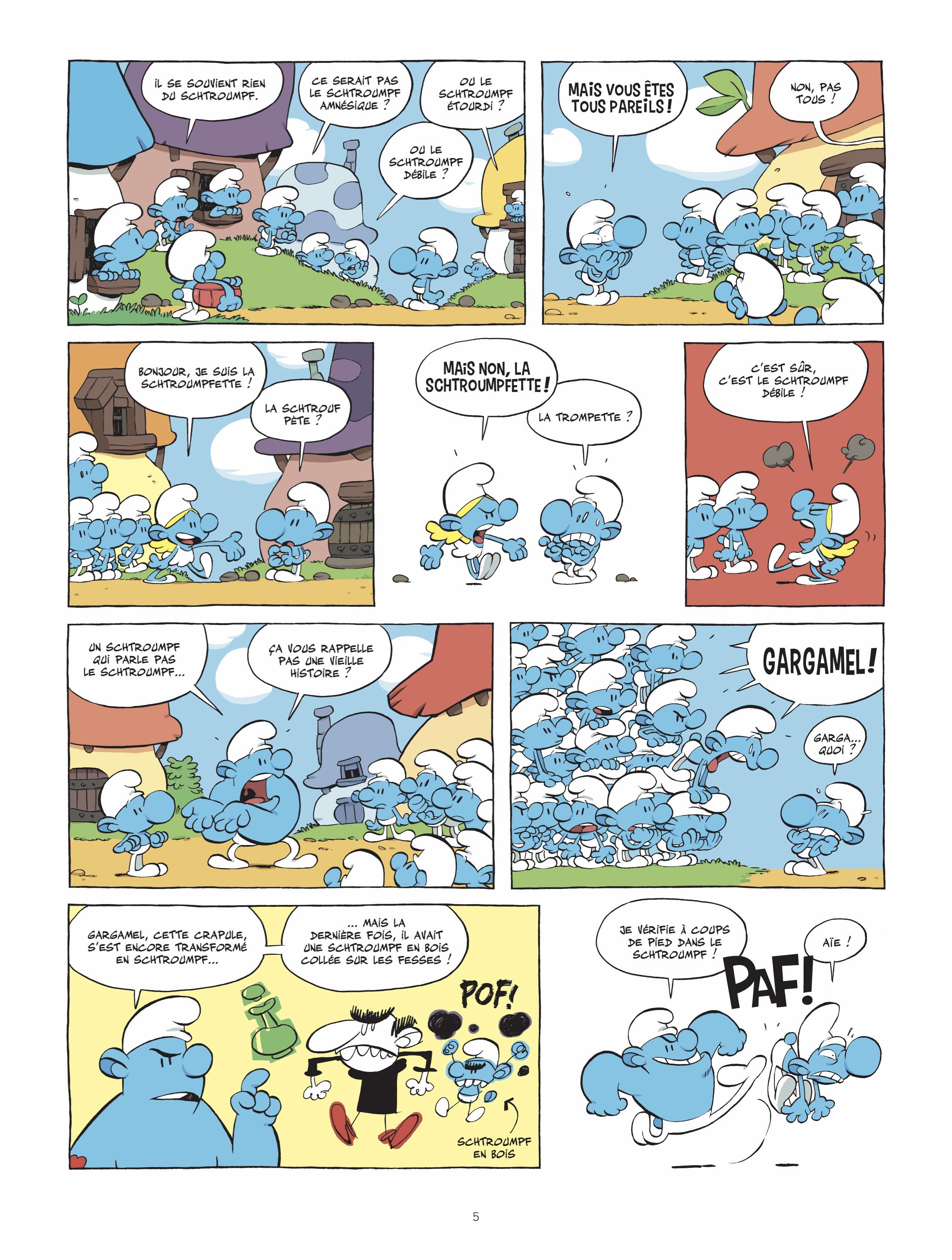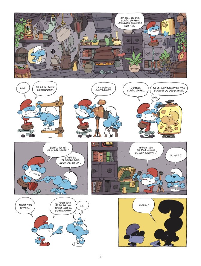 Dans la grande tradition du burlesque, dans ses bandes dessinées on se tape dessus (ici avec des poêles, des casseroles…), on court beaucoup (pour poursuivre, fuir…), on se déguise pour se camoufler (avec des orties)… Le corps est ainsi fréquemment atteint, éprouvé, remodelé… Il subit également des transformations. Celles-ci sont au cœur de l’intrigue, le Schtroumpf inconnu s’avérant être… une belle surprise ! Le verbe n’est jamais oublié, les dialogues étant souvent tordants.