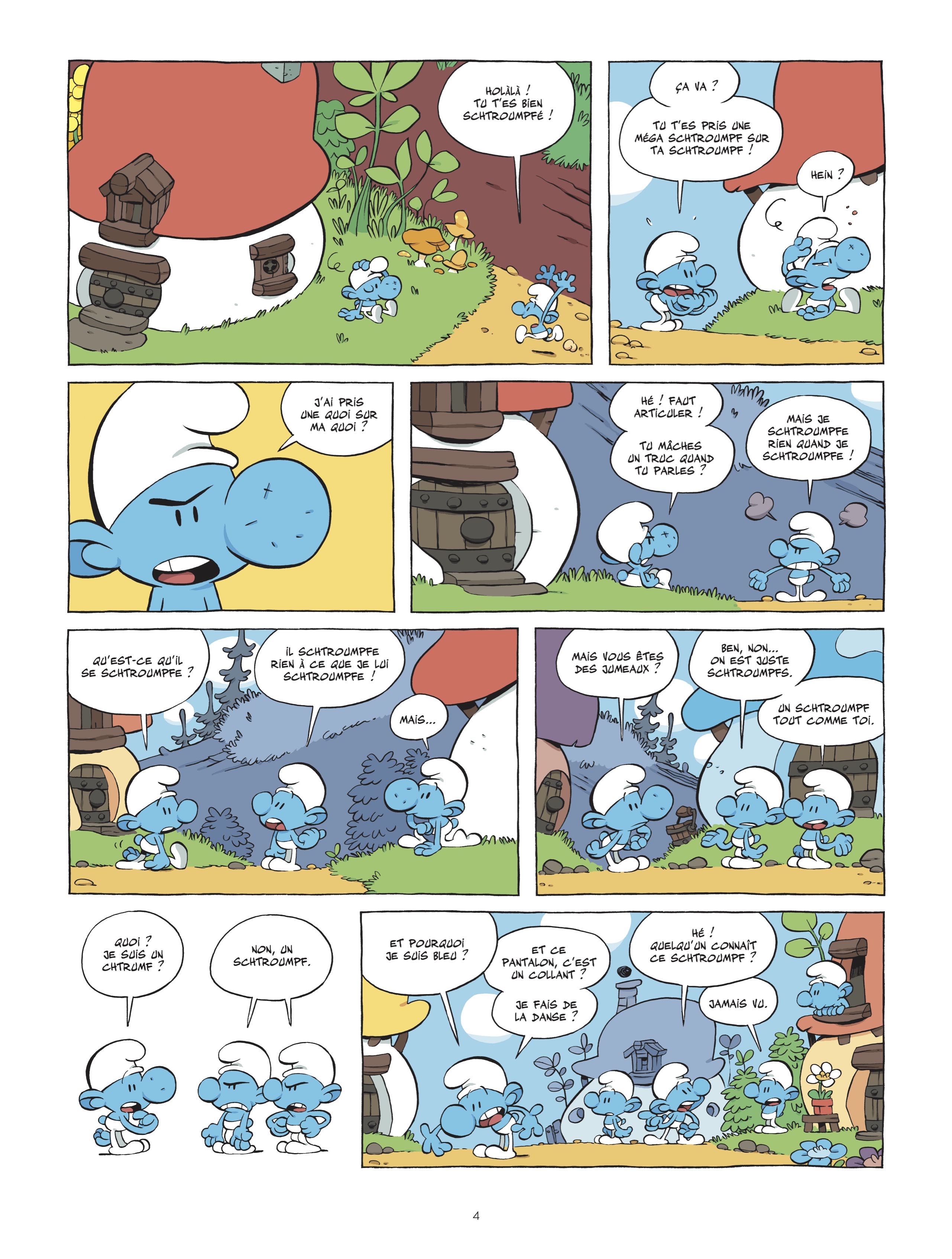 Résumé : Un Schtroumpf se réveille sur le toit d’une maison et en tombe. D’autres Schtroumpfs viennent à sa rencontre, mais il ne comprend rien à ce qu’ils racontent. Et pour cause : il ne parle pas le Schtroumpf ! Cerise sur le schtroumpf : il est amnésique. Qui est-il, d’où vient-il et comment est-il arrivé là ? Avec la Schtroumpfette, le Schtroumpf à lunettes et le Schtroumpf costaud, il part en expédition afin de trouver les réponses à ces questions.