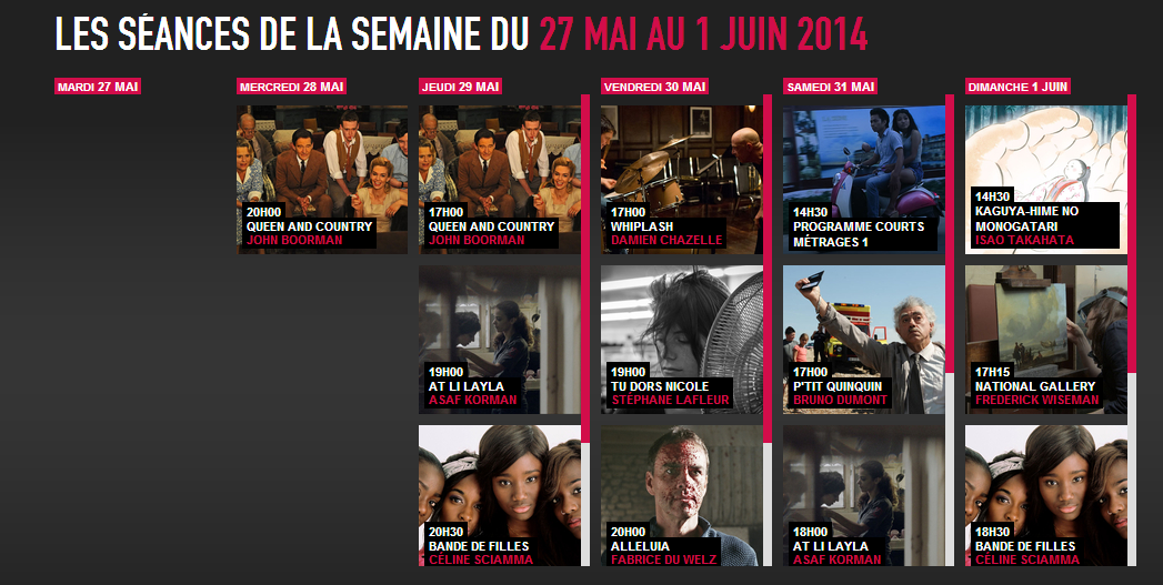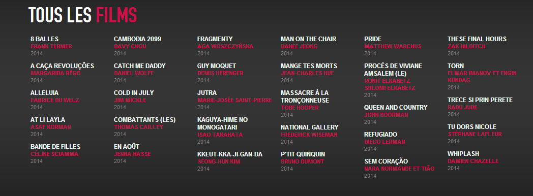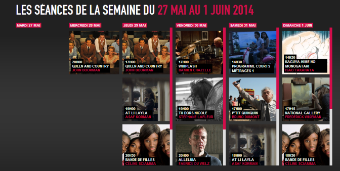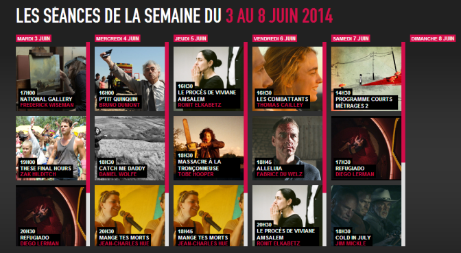 Comme chaque année, le Forum des Images invite la Croisette à Paris, pour les spectateurs parisiens frustrés par le manque de soleil et d’aventures cinématographiques en ce mois de mai où tous les yeux sont rivés sur Cannes. La Quinzaine des Réalisateurs n’est pas une menue compétition, cette sélection rassemble toujours un panorama riche et dense de l’actualité cinématographique mondiale, via des réalisateurs d’une grande pertinence, de générations brassées entre noms confirmés (Boorman, Fabrice du Welz, Fredrick Wiseman, Ronit & Shlomi Elkabetz) ou non. Et cette année, on note une présence d’oeuvres radicales (la version restaurée du Massacre à la tronçonneuse de Tobe Hooper ou l’excellent Cold in July de Jim Mickle,) ainsi que la Queer Palm 2014 (Pride). On vous conseillera également l’épatant Les Combattants de Thomas Cailley.
