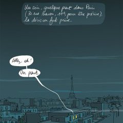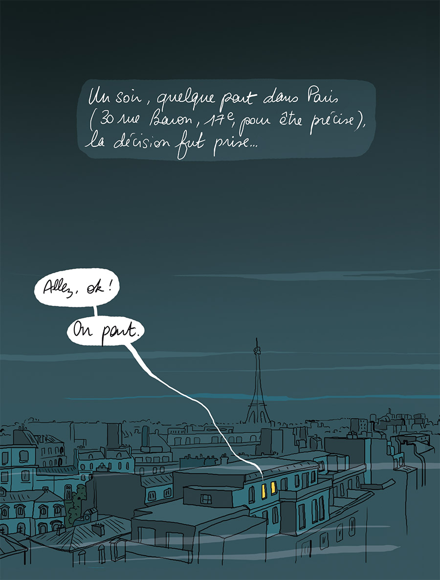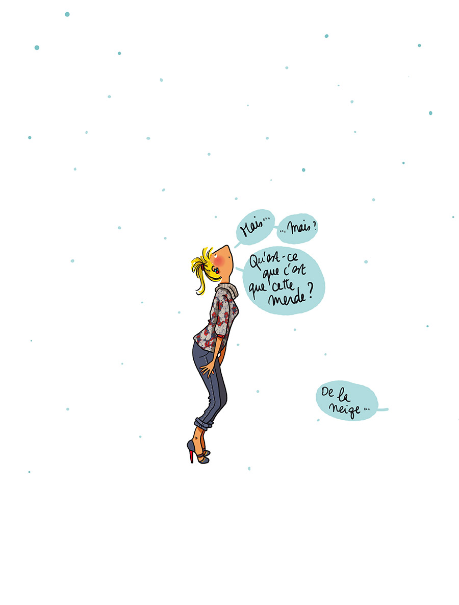 Partir de Paris pour la province, un scénario qui n’a rien de très original, en tout cas pas vraiment digne de s’étaler sur un un album entier. Quitter la capitale pour un chalet perdu dans les Alpes, troquer le métro pour les chaînes contre la neige, c’est raconter un passage brutal, une vraie rupture dans la vie d’une famille. Quand Mademoiselle Caroline, illustratrice, accompagne son mari avec ses enfants jusqu’en Haute-Savoie, dans une vallée perdue près d’Annecy, tout son entourage la plaint toujours, la prévient souvent, la retient un peu. Sans chichi, sans esbroufe, elle cherche à raconter les difficultés de l’emménagement, les qualités et les défauts de ce nouveau lieu, les obstacles et les avancées que propose cette nouvelle vie. Cela va des courses, élément évidemment attendu, aux plus intimes et drôles réunions de vente à domicile de sex-toys. La grande force de cet album, c’est surtout son objectivité, alors que la narration est très subjective. L’absence de jugement n’est pas évidente, mais elle renforce ce côté chronique, en dépit de quelques légers coups de gueule souvent décalés et ironiques.