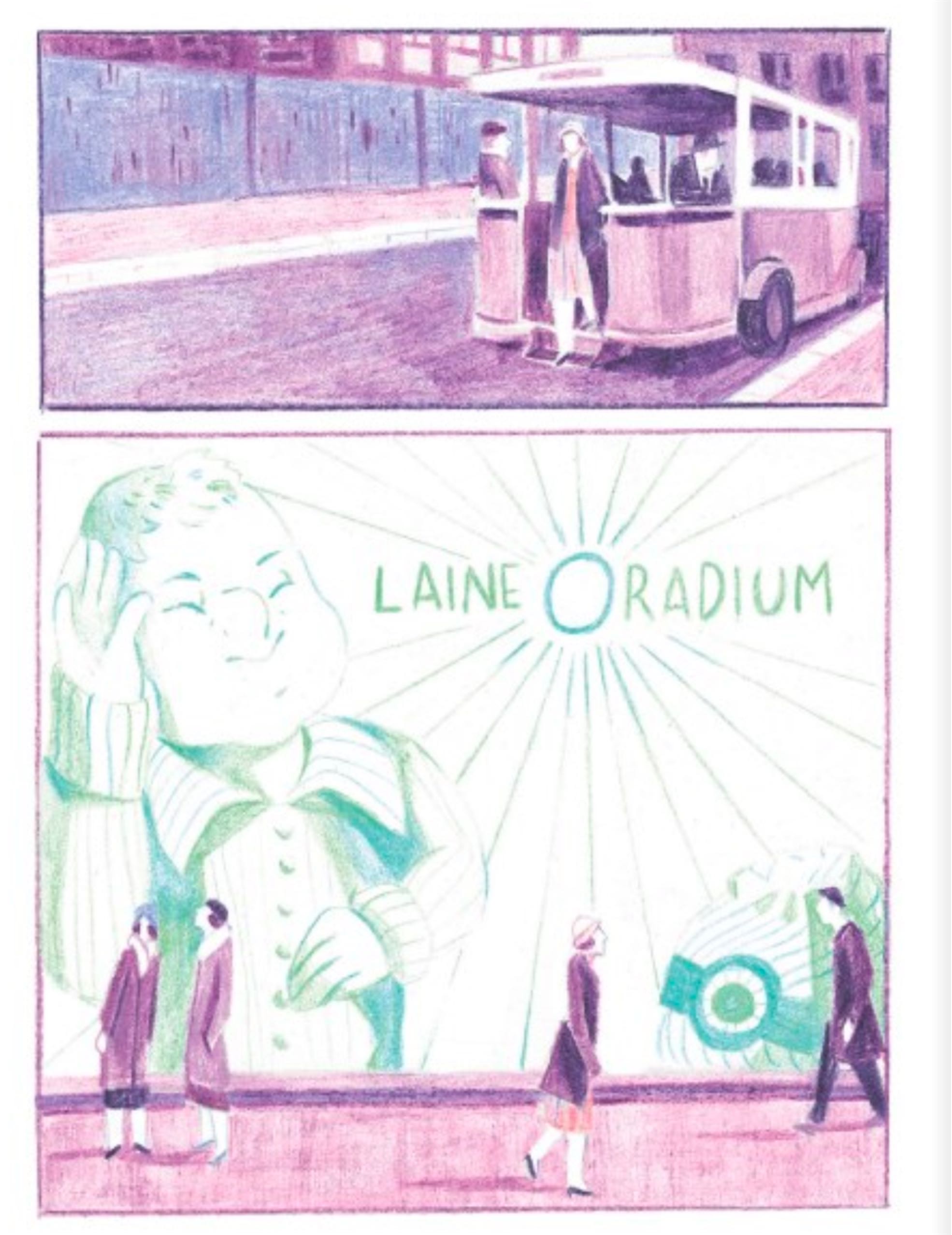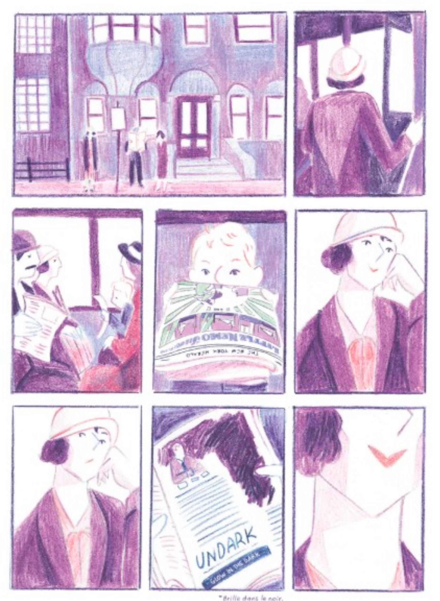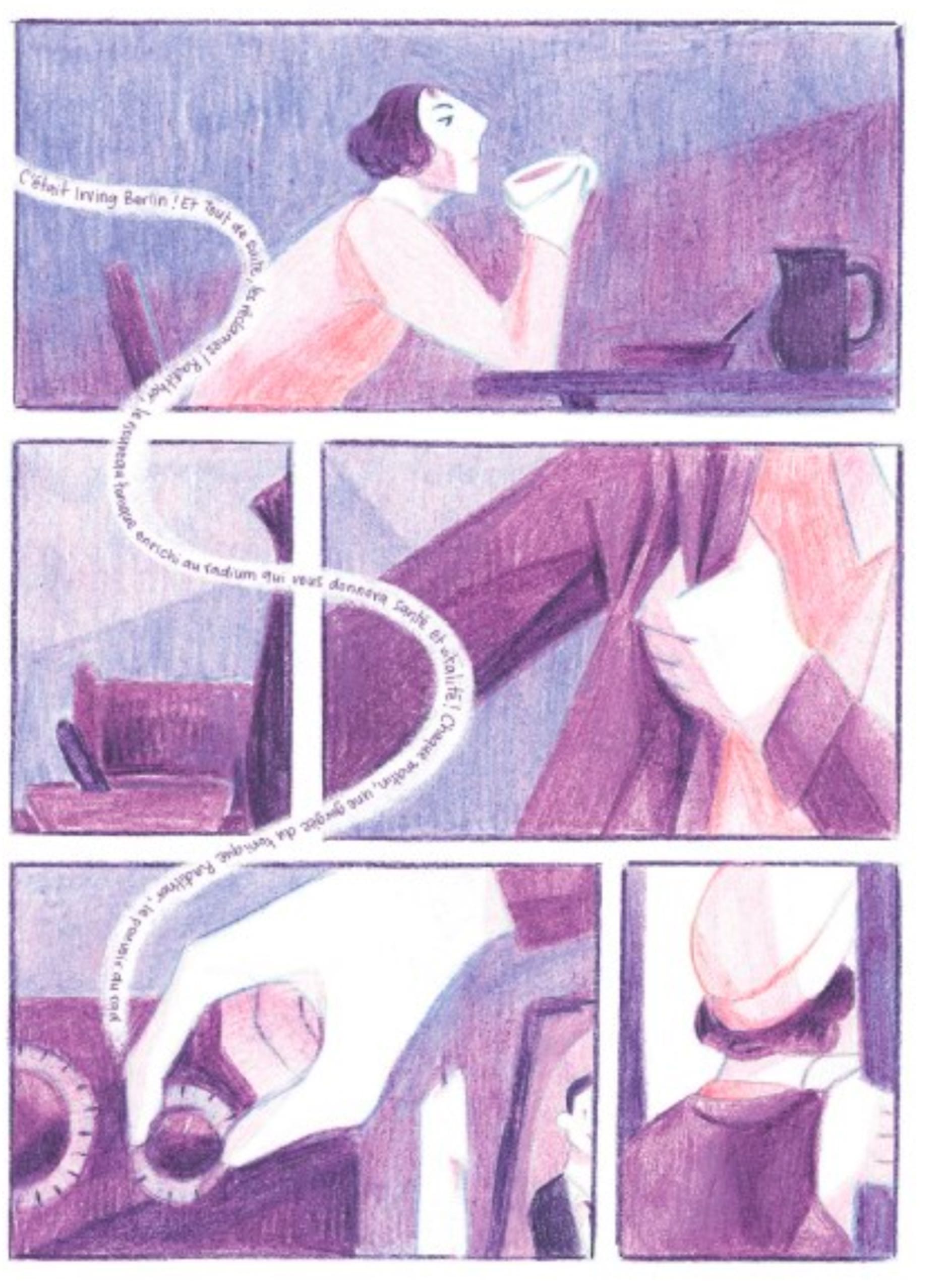 Le dessin semi-réaliste, pertinent et somptueux, quelque part entre l’Art déco et le manga, comme les couleurs pastel réalisées au crayon, apportent une fraîcheur et une douceur. Cela contribue pleinement à la fluidité du récit, à son ampleur, mais également à sa noirceur. La palette réduite (rose, violet, vert) semble d’abord correspondre à la légèreté affichée de certains des personnages, avant de suggérer celle délétère de l’industrie qui sacrifie sans souci ses salariées malgré les doutes et les avertissements.