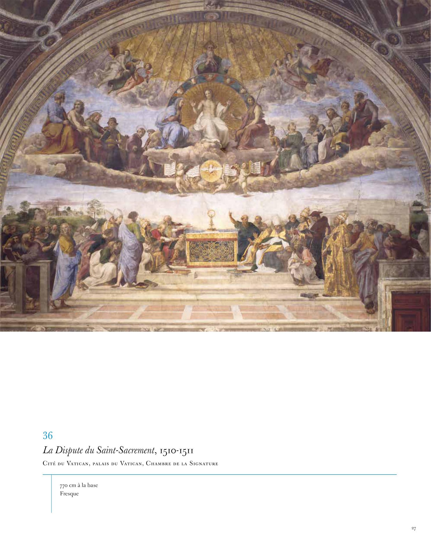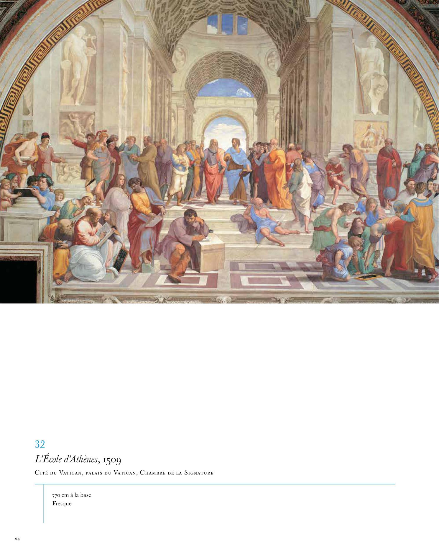 Prenons, pour seul exemple des nombreuses toiles présentées, la célèbre "école d’Athènes" qui met en scène les héros de la sagesse antique, fondation traditionaliste de la Renaissance au cœur du potentat chrétien. Deux détails, parmi de nombreux, sont explicités. Le premier est à l’extrémité droite. Parmi les hommes d’esprit, célèbres, discutant activement du monde sur ce forum, le peintre glisse son autoportrait entre la sphère céleste de Zoroastre et terrestre de Ptolémée. Il fixe des yeux le spectateur. Est-ce une manière en clin d’œil de signer son œuvre ? D’affirmer sa conception de la vie ? Est-ce un cabotinage outrecuidant ? Est-ce l’affirmation de la permanence, malgré la diversité des époques, des grands principes philosophiques de l’éternelle pensée humaine, comme le suggère le titre du chapitre présent et passé ?