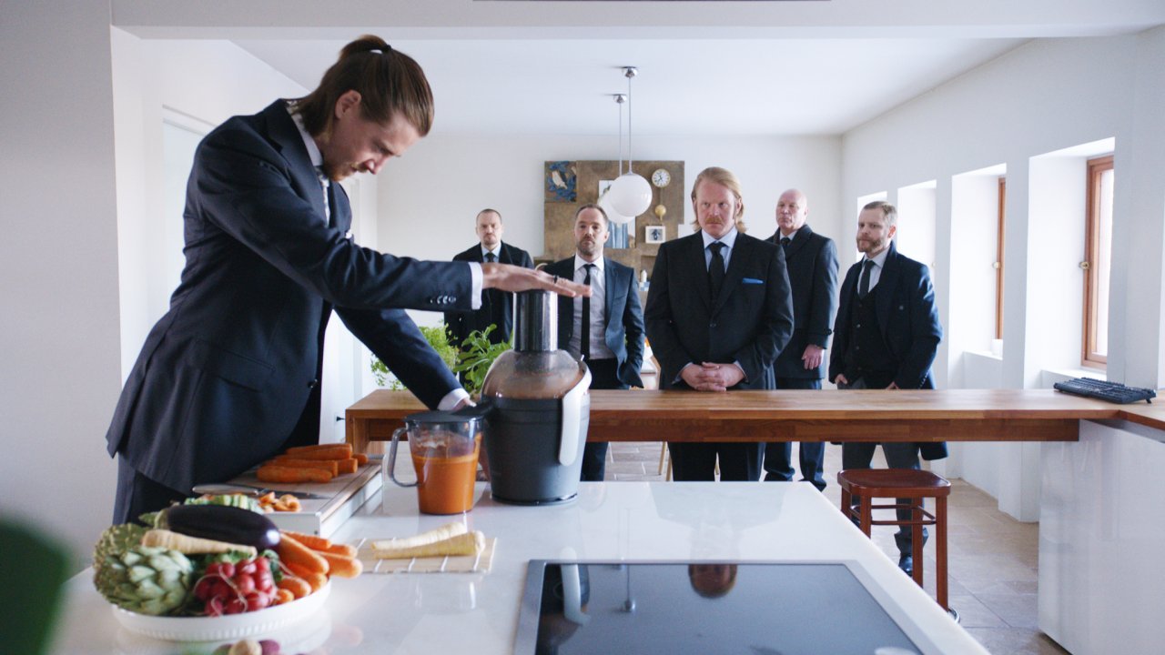 Le film lui même est ponctué par des cartons faisant le décompte des personnages qui meurent tout au long du métrage (plus d’une vingtaine). Leurs noms apparaissent, avec un symbole religieux pour signifier leur obédience religieuse. Tragique et comique fonctionnent ainsi main dans la main, les scènes les plus dramatiques pouvant aussi être les plus drôles. Entre guerre des gangs et western hivernal, le film possède aussi une atmosphère très singulière, baignant certains plans dans une mélancolie contemplative appuyée par un thème musical à la guitare. Mais le point fort, du moins le plus marquant, est sa galerie de personnages, essentiellement masculins, même si l’ex-femme du Comte, le chef des trafiquants de drogue, et l’épouse asiatique remontée du frère de Dickman valent leur pesant de cacahuètes (cette dernière ira jusqu’à cracher sur la tombe de son conjoint). Nous avons d’abord deux figures de meneurs. Ce fameux Comte, joué par Pal Sverre Hagen, est une sorte de dandy fan d’art contemporain (le décor de sa maison laisse pantois), grand enfant capricieux, végan et psychotique, toujours à la limite de la dépression nerveuse, excessif en permanence. De l’autre côté, Pa, interprété par Bruno Ganz, n’en est pas moins cruel mais plus retenu et sombre. Il dirige le clan rival. Norvégiens et Serbes s’affrontent sans savoir que le semeur de troubles n’est autre qu’un petit Suédois lambda qui a du mal à digérer la perte de son fils unique. Comme sortis d’un film des frères Coen, ces personnages s’appellent par des surnoms absurdes (Wingman inspiré de Top Gun, Chinaman pour désigner un tueur à gages danois d’origine japonaise, etc.) et ont un avis arrêté sur tout : le système de sécurité sociale norvégien ("Le soleil ou le social, il faut choisir !") ou encore l’obsession des Nordistes pour l’environnement (la séquence de ramassage de crottes de chien). Ils en sont tous réduits à une pantomime bestiale et tirent avec leur flingue avant de réfléchir.