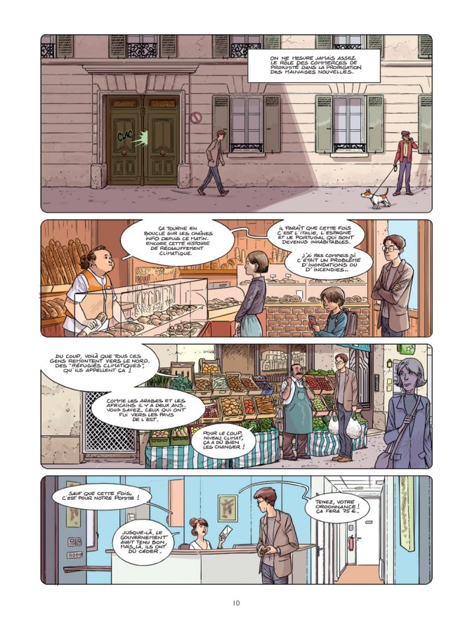 David Ratte a eu l’idée de cette histoire pas si dystopique que ça. Qui sait où nous mènera le réchauffement climatique ? En tout cas, cela lui permet de réunir deux personnages opposés, Clément et Maria. Il écrit, dessine ce récit et en réalise les couleurs avec Matteo Ratte.