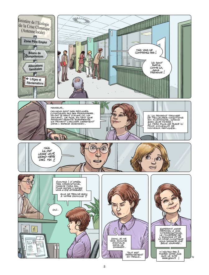 La situation que décrit David Ratte, le décor de cette histoire, cette catastrophe climatique qui frappe les pays du sud de l’Europe, la décision gouvernementale qui impose aux français d’héberger ces Européens jetés sur les routes par les inondations dramatiques de la Méditerranée et de l’Atlantique, et puis les réactions des gens de la rue, pour ou contre cette immigration, nous rappelle les grands questionnements de ce début de siècle et nous invite à la tolérance : face au sursaut de furie de la terre devant nos actes inconséquents, il va bien falloir se serrer les coudes. Un double message dans cette BD, un grand rappel écologique et un quotidien tourné vers la tolérance.