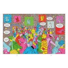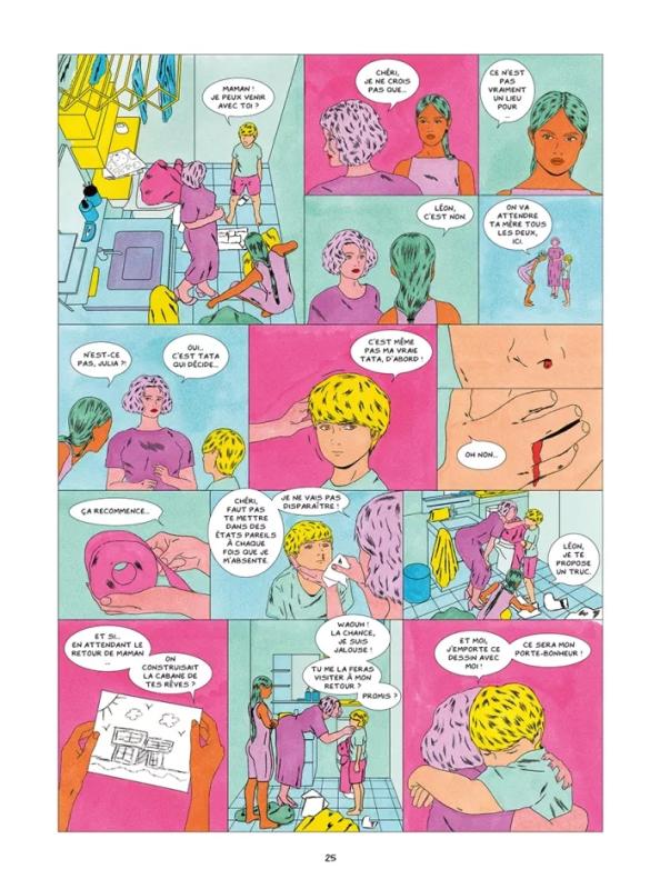 Le cadre, justement, est une autre de ces qualités dont regorge l’album. Déjà, de par ses couleurs très flashy, on retrouve des influences graphiques digérées, entre Druillet et plus récemment Flipette et Vénère, avec des formes plus carrées que rondes, qui pourrait être en décalage avec le récit quasi fantastique qui rythme la trame. Des planches avec un spectre en cape fuschia, des masques de couleurs primaires, on est loin du gothique de Poe ou du luxe d’un Eyes Wide Shut. De plus, le luxe, s’il se retrouve dans les jouets envahissants, se lit à travers une expression architecturale fine et épurée, avec des intérieurs et extérieurs dressés comme des lieux clefs, maisons grâce à leurs formes, symboles par leurs perfections.