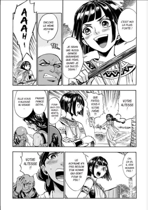 En outre, l’histoire d’Hachepsout est prenante et on s’identifie assez bien à notre héroïne. On a envie qu’elle s’épanouisse et qu’elle prenne enfin son indépendance vis-à-vis des normes et du regard des autres. Si ce manga relate le combat de cette femme pour s’imposer dans l’Égypte Antique, il se fait écho d’un contexte encore actuel où la question de l’intégration de la femme dans notre société est encore débattu à de nombreux égards.