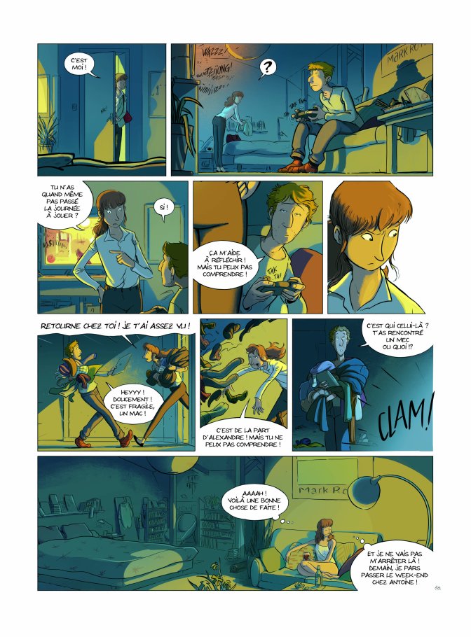 Bertrand Escaich : Par rapport à ce que tu dis, en technique BD pure, pour enchaîner deux situations tu as plusieurs possibilités. La première est la continuité, exemple : Un type rentre chez lui le soir, il prend un bus, descend du bus , ouvre la porte de son immeuble, de son appartement, allume la lumière... Ça peut durer à l’infini. Tu peux raccourcir : le bus qui roule et après, le type est dans son canapé ! Tu peux faire encore plus rapide : il est directement dans son canapé, tu comprends qu’il est rentré chez lui. Ou encore, tu peux le montrer chez lui en train de faire quelque chose. Mais tu peux aussi d’abord montrer un verre de vin sur la table. Et on comprend qu’il s’est installé et qu’il a sorti du vin. Enfin, l’alcool est à consommer avec modération, hein ! (rires) Il y a plusieurs possibilités. Et dans notre récit, on a fait le choix d’ellipses qui allaient montrer des scènes posées, plutôt jolies, de détente, agréables, où on avait envie d’être.