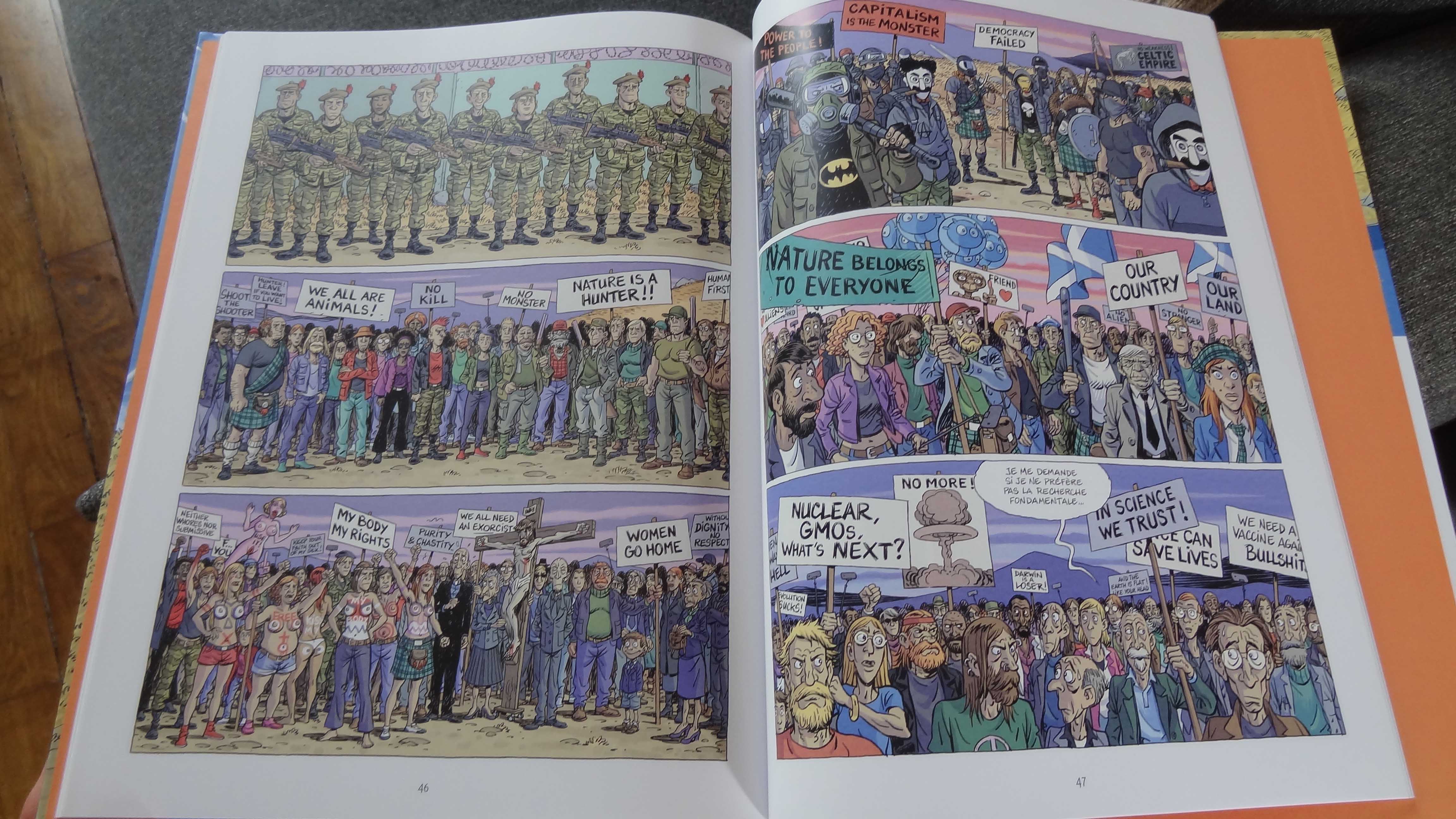 En parlant de pages, il y a une double page qui plaît beaucoup, très complexe au dessin car elle comporte énormément de personnages, mais très simple et très efficace dans sa construction. Celle où tous les groupes se font face.