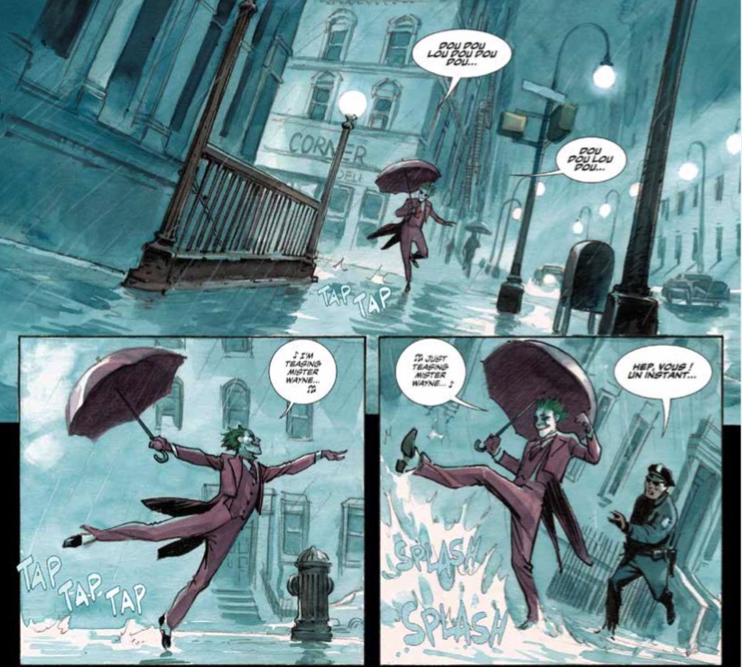 J’ai voulu revenir aux racines mais sans aller jusqu’aux toutes premières aventures. Je ne voulais pas non plus m’inspirer des années soixante qui étaient plus colorées, presque parodiques. Se démarquer du personnage de Batman a été difficile parce que je le voulais assez sombre et mystérieux. D’ailleurs, je le représente dans l’ombre, on ne voit pas ses yeux. Il est plus détaché, presque introverti, statuaire. Je voulais que son costume ne soit pas trop détaillé, sans gadgets. En revanche, le Joker je le voulais plus coloré, je le voulais différent pour qu’on reconnaisse ma touche personnelle. J’ai fait beaucoup d’essais et j’ai décidé de lui faire un maquillage. Ce n’est pas tout à fait le même joker que celui raconté par Alan Moore ni celui de Tim Burton où on voit Jack Nicholson tomber dans l’acide. Beaucoup d’histoires se basent sur cette origine-là pour sa création. C’est d’autant plus explicite que c’est Batman qui le pousse. Comme je ne racontais pas l’origine de ces personnages, je voulais trouver une approche plus réaliste. Je voyais le joker comme un psychopathe bien sûr mais pas avec la peau brûlée. Il est pâle peut-être, mais il se maquille, un peu comme un clown. Je trouvais que ça n’enlevait rien à sa folie. Comme il n’y a pas de personnages avec des supers pouvoirs dans mon histoire, je trouvais inutile d’en faire une sorte de mutant. C’était ma façon de me démarquer.