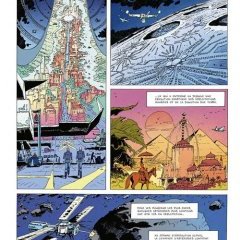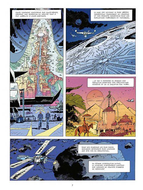 Pour illustrer ce voyage, qui emmène dans le passé historique, le futur lointain et dans le présent immédiat, Vincent Perriot présente une narration en forme de dialogue, comme un ouvrage des Lumières à la Diderot, faisant autant voyager son lecteur et lui apprenant tout autant. Son goût pour les vaisseaux est mis en avant, et même un peu moqué par son interlocuteur, les modèles de cités spatiales imaginées il y a maintenant cinquante ans sont superbes, mais ce que l’on retient, c’est le gigantisme des décors, la multitude des exemples, que ce soit pour évoquer les minerais restants ou la consommation de viande, comme si le talent s’était mis au service d’une infographie pratique pour choquer, montrer, avertir. Les amateurs de Negalyod retrouveront cette ambiance post apocalyptique, un monde que l’auteur avait déjà envisagé privé de ressources, lui-même expliquant que ce thème l’avait alerté et inspiré.
