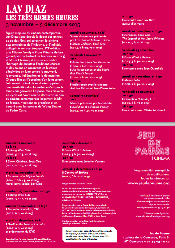 La programmation, supervisée par Antoine Thirion, producteur et critique de cinéma, promet de belles découvertes et de nombreux rendez-vous avec le cinéaste qui sera présent à Paris. Parmi les événements qui accompagnent cette rétrospective, une table ronde à ne pas manquer, en la présence de Lav Diaz, animée par Jean-Pierre Rehm (directeur du FID Marseille) et Antoine Thirion aura lieu le vendredi 6 novembre.