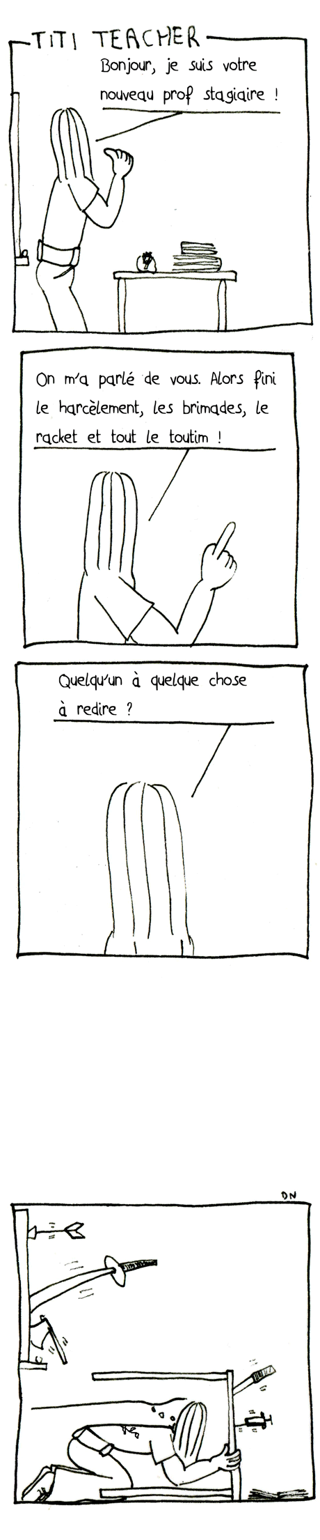 Sans oublier maintenant une fille un peu folle qui va remettre de l’ordre par le vide. Mais la chute du tome – dans tous les sens du terme - devrait impliquer plus le monde des adultes. En effet, le corps enseignant ne répond pas vraiment présent, les parents n’ont pas vraiment l’air bien dans leurs chaussures, quant au reste de la société...