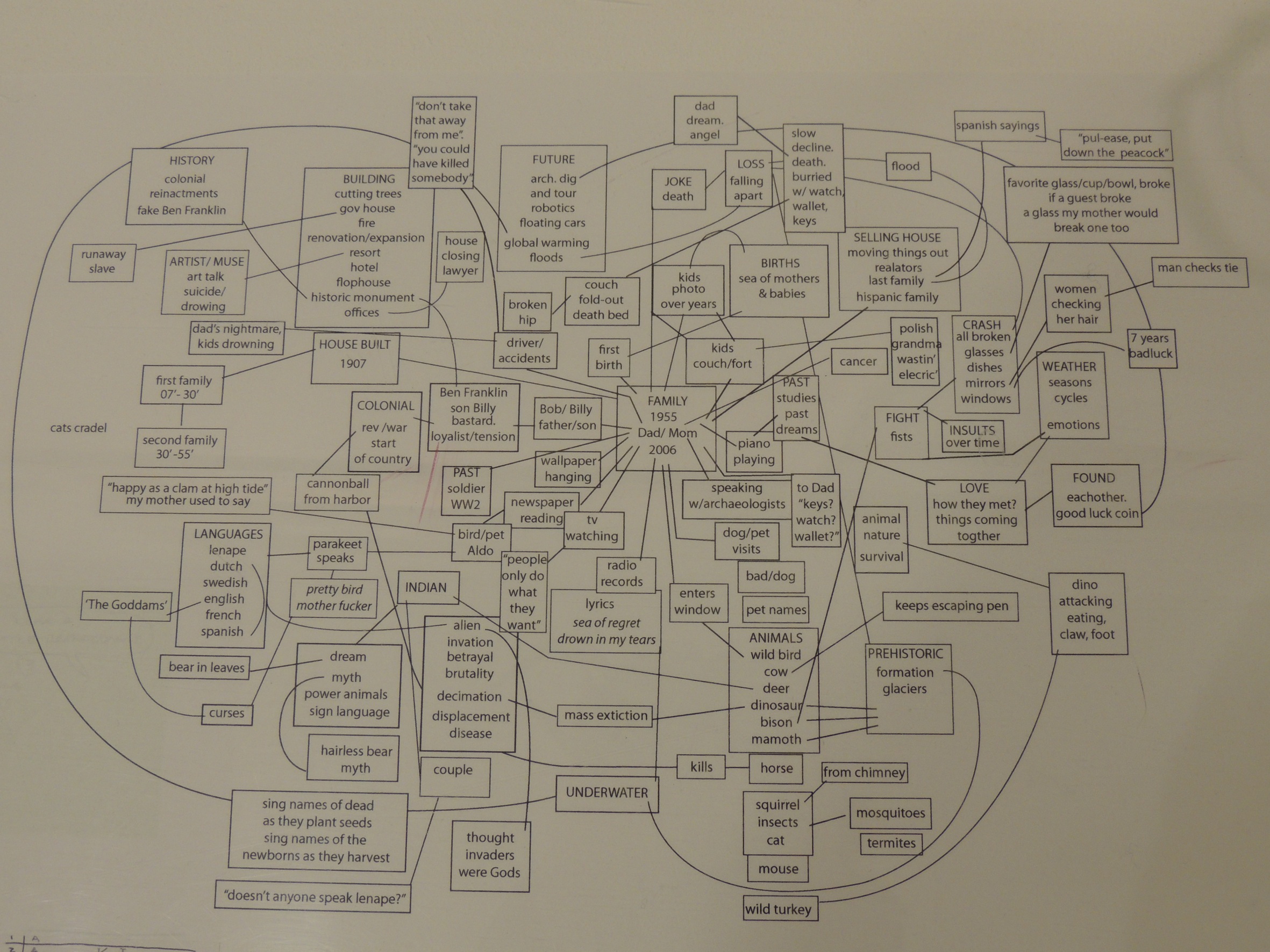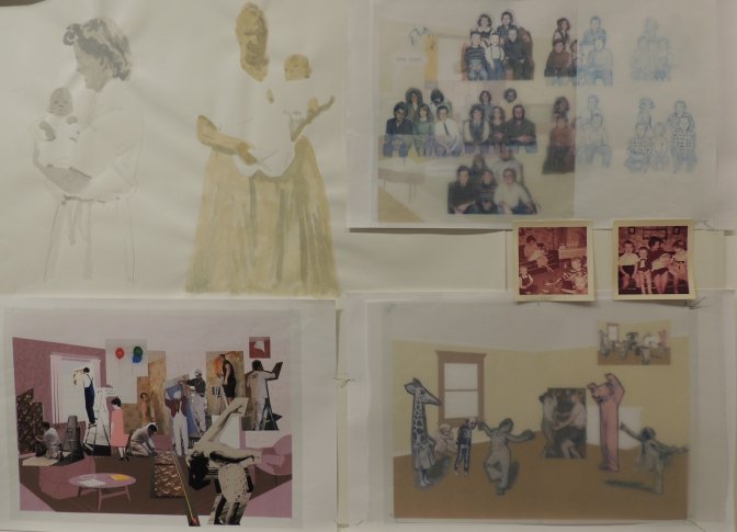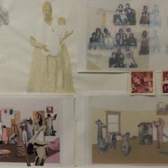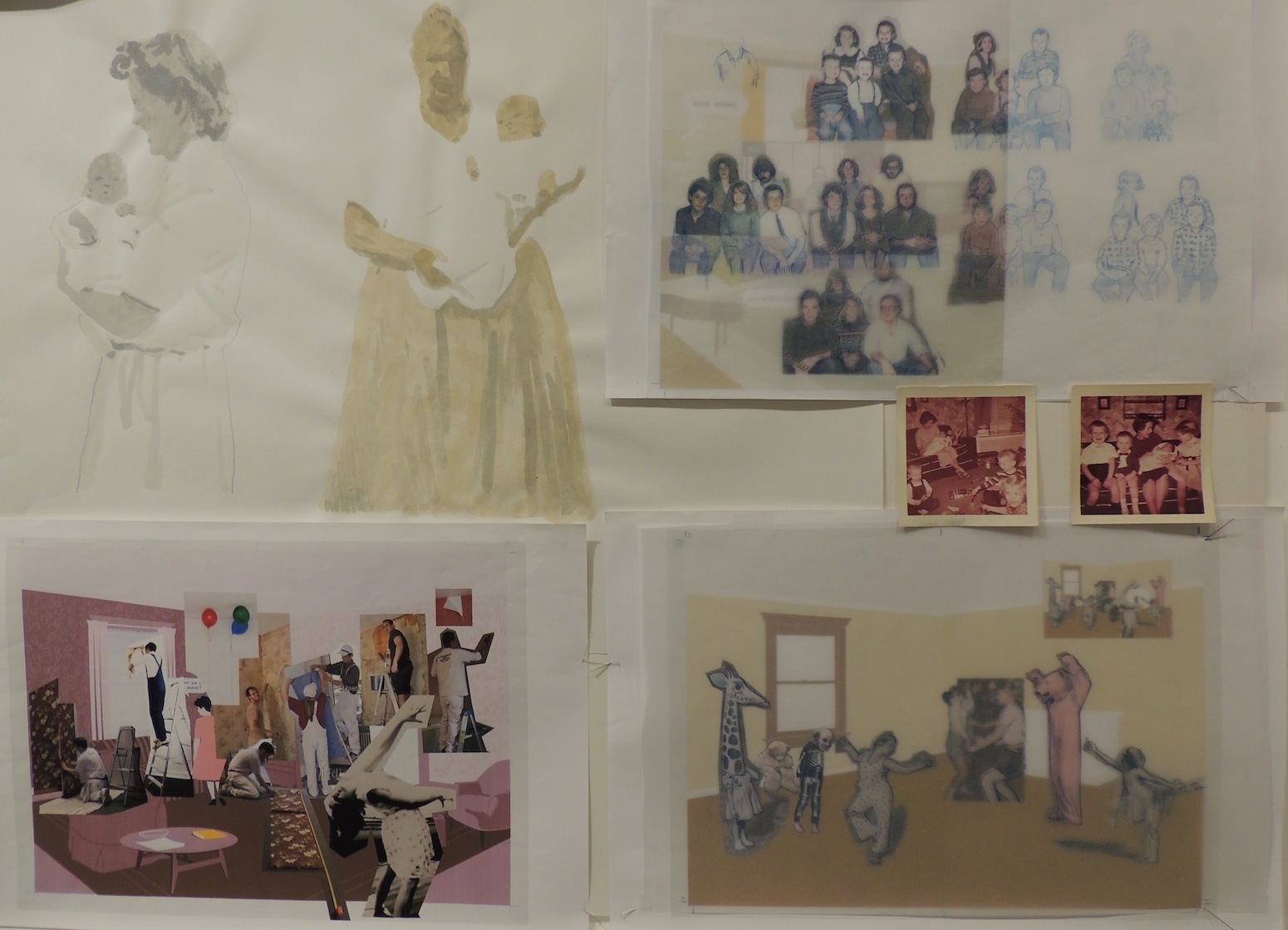 De l’autobiographie à l’universel il n’y a qu’un pas chez McGuire, ce que révèlent certains travaux de recherche que l’auteur a amassés pendant 25 ans, accessibles dans l’exposition. Des reproductions en acrylique sur bois de certaines pages de l’album y sont mises en perspective avec les documents préparatoires de l’artiste, permettant une approche sensible de son processus créatif. Les photos de famille, collages, calques, aquarelles, dévoilent la matière intime et complexe de son œuvre : en vue de créer une poésie du Temps, McGuire puise des instants, des postures, issus de souvenirs familiaux et, les fait rimer avec des éléments extérieurs. Les recherches de texture, de motifs tant graphiques que gestuels, et leur mise en réseau fondent la mémoire fictive de ce lieu, dont les éléments n’ont de sens que par leur coexistence.