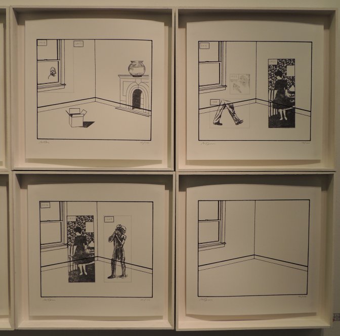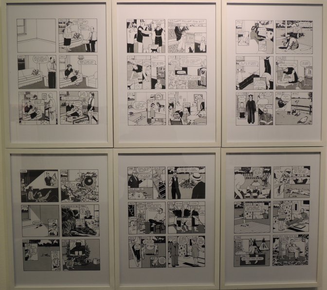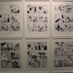 Plus loin, les tableaux reproduisant certaines cases du livre, sorties de leur contexte, ne raviront que les acheteurs, tandis que les splendides sérigraphies en noir et blanc inviteront à la contemplation. Variations de motifs tirés de l’album, agrémentées de dessins au crayon et de fragments tamponnés jouant par définition sur la reproduction, elles accentuent la beauté du jeu de répétition et y ajoutent la sensation d’effacement au fur et à mesure que l’encre se tarit, ne traduisant que mieux la dissipation de l’existence.