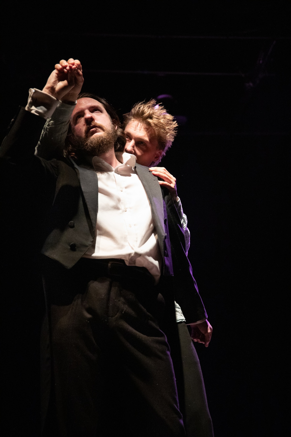 Critique : Rimbaud-Verlaine : Viœlences n’est pas un simple spectacle de récitation de poésies. C’est d’abord chez le jeune belge Antoine Giet la démonstration de son intérêt particulier pour les œuvres de la fin du 19ème siècles qui marqueront tant la poésie surréaliste du siècle suivant. Le metteur en scène plante son décor au cœur des réunions des Zutiques ou des Vilains Bonhommes où les écrivains déclament leurs œuvres peut-être à la manière aujourd’hui dont les jeunes gens luttent à coups de battles verbales. Il faut dire que l’auteur dont une partie du texte s’empare des poésies du moment s’est bien documenté. Il s’inscrit en référence à la période sombre de la Commune que l’Etat français a combattu dans une rare violence. Et pourtant, le miracle des communards témoignait déjà de la volonté toute moderne de rendre les femmes égales aux hommes, et de faire valoir la libre pensée comme le fil conducteur de la politique. Ce miracle sera de courte durée et Rimbaud prendra le risque de se revendiquer une posture révolutionnaire, malgré les arrestations musclées qui ont perduré plus de 10 ans après la Révolution de 1871.