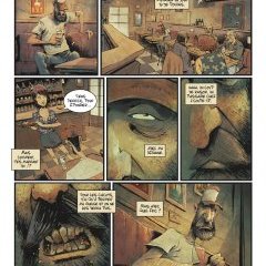 Julien Monier traduit l’ambiance scénaristique en image à la perfection. Les dessins sont fluides mais ternes, comme constamment tachés et salis. Les cadavres et autres bestioles installées dans les corps en décompositions sont représentés avec beaucoup de détails et les divers flashback et moments de narration nous plongent dans des ambiances de films policiers. L’usage du bleu en opposition au marron sale du reste de l’album est restreint aux instants de solitudes et de rêveries de Derrick. Ces moments comme lorsqu’il rentre seul le soir chez lui ou qu’il se couche, enfin débarrassé de l’angoisse de sa propre vie.