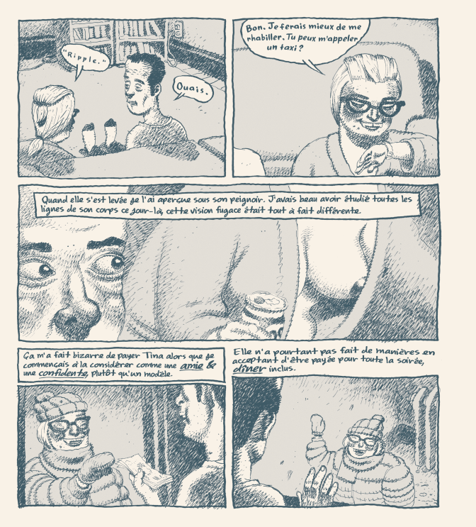 Enfin, le personnage de Tina s’avère particulièrement réussi. La femme timide se transforme par moments en ogresse au rire gras et sans manières. Sa représentation graphique défie les normes en vigueur : ses seins pendent, sa dentition est irrégulière, ses bourrelets flottent, à l’opposé de la représentation normée des femmes dans la bande dessinée. Tina est également une femme de caractère, capable d’exprimer franchement son désir et de se défaire de Martin lorsqu’elle le souhaite. Ce qui n’empêche pas le récit d’épouser clairement le male gaze de son auteur.