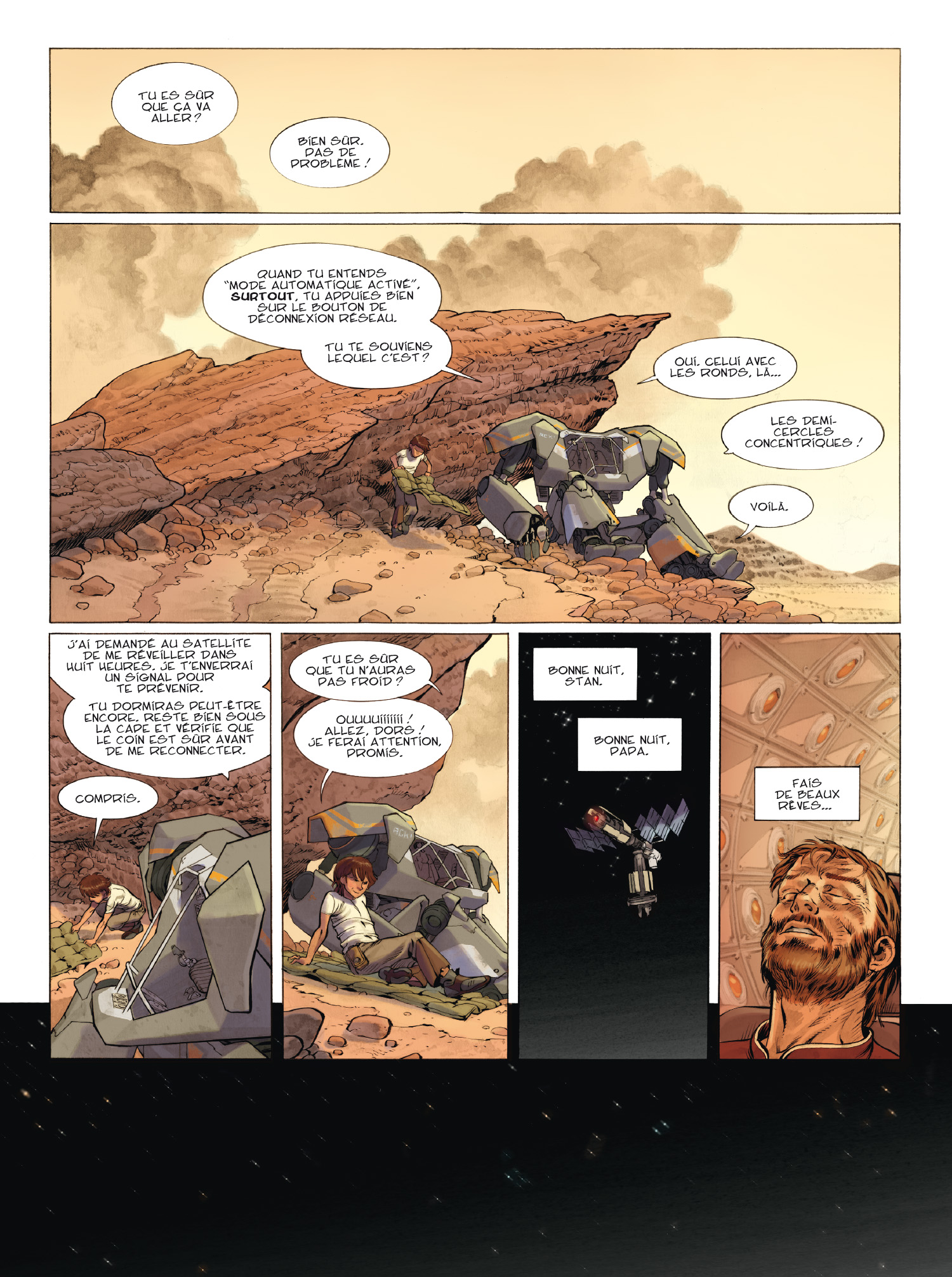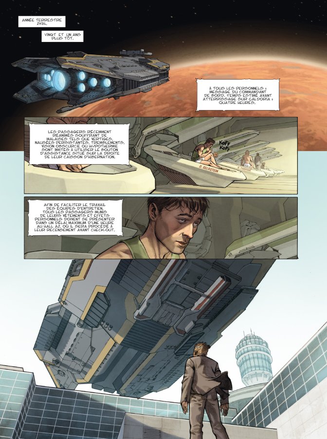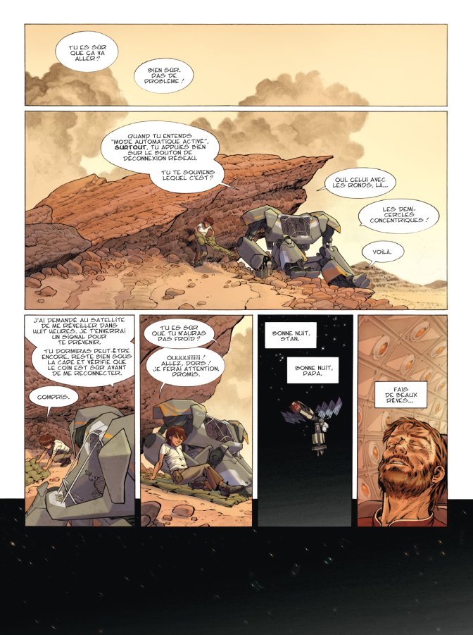La planète coloniale Caldoria est en ruines, la faute à une rébellion de l’intelligence artificielle, qui a jugé que l’humanité s’en sortirait mieux en étant exterminée ou réduite en esclavage. Le chemin continue (et s’achève) pour Stan et son partenaire robotique en surface, tandis que son père tente désespérément, bloqué dans un vaisseau en orbite, de contrecarrer les plans de l’IA. Ce second volume vient clore la série de manière réaliste et aboutie : le combat doit avoir une fin, et il faudra pour cela des sacrifices, des deux côtés. La scénarisation, qui fait la part belle en début d’album aux flashbacks, entrecoupés d’ellipses à chaque planche, offre une plongée dans les sentiments du père, tout en apprenant aux lecteurs les raisons du chaos qu’il a découvert dans le premier tome. Les réponses sont là, l’action laisse temporairement place à l’émotion, avant que l’on ne retrouve les poings ravageurs du robot Rocky, aux prises avec de multiples ennemis.
