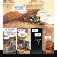 Ces ennemis d’acier, aux caractères de plus en plus organiques (dans les réactions et l’apparence), ne sont pas sans rappeler les univers de Matrix ou Terminator. Clairement, Rock and Stone est une bande dessinée qui a les codes (et la fière allure) d’un film à grand spectacle. Les ingrédients sont d’ailleurs réunis pour un franc succès hollywoodien : la relation compliquée père-fils, le jeune intrépide passionné de comic et de robot, des personnages secondaires plus ou moins courageux, un ennemi sans pitié... Finalement, les combats sont plutôt secondaires, ou en tout cas ne sont plus centraux, au contraire du premier tome. Suivre la progression de Stan et son père se fait en jonglant avec leurs difficultés respectives, avec les ralentissements et les pièges successifs qui les poussent à prendre des décisions. Du coup, la scène finale, combat héroïque s’il en est, apparaît presque décevante, ou en tout cas loin du combat légendaire attendu... Mais l’impression de réalisme, qui enveloppe ce récit de science-fiction sur une planète inconnue, n’en est que renforcée. Pas de temps pour les larmes, pas de temps pour des explosions apocalyptiques, même l’épilogue est plutôt sobre. Un choix qui donne à la série un cachet particulier, en fin de compte plutôt éloigné du genre hollywoodien.