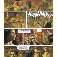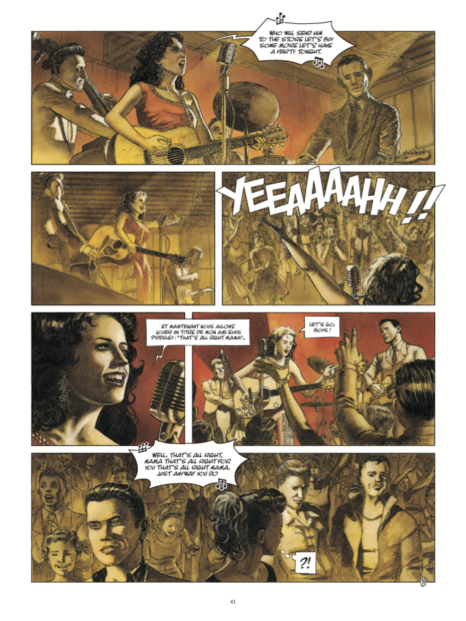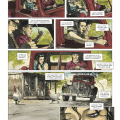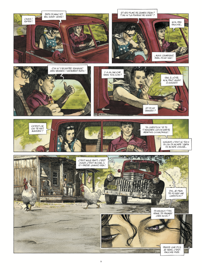 Ce portrait de famille au rythme enlevé est porté par les planches académiques – dans le bon sens du terme – de Christophe Dubois : réalisées en couleur directes, celles-ci peignent avec un réalisme saisissant l’Amérique rurale de cette époque. Le lecteur peut sentir la rouille des voitures et la moiteur de l’atmosphère des concerts, la poussière qui colle aux vêtements, l’odeur du tabac et de la popote réalisée dans des cocotes mal lavées. Les jeux de symétrie dans chaque case, le clair-obscur des planches nocturnes, la représentation des costumes et des visages : tout est soigné et maîtrisé. Impossible pour le lecteur de ne pas s’arrêter sur quelques-uns des multiples détails présents dans chaque planche.