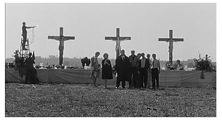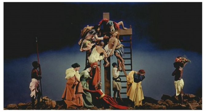 Au travers de l’histoire, terrible et grotesque à la fois, de Stracci, le figurant qui joue le rôle du bon Larron et meurt d’indigestion sur la croix après s’être goinfré de ricotta lors d’une séquence carnavalesque digne de Jérôme Bosch, l’auteur d’ Accatone célèbre à nouveau la grâce fruste des visages et des corps prolétaires et contrebalance le sens de la cruauté et du tragique par une espèce de candeur maintenue envers