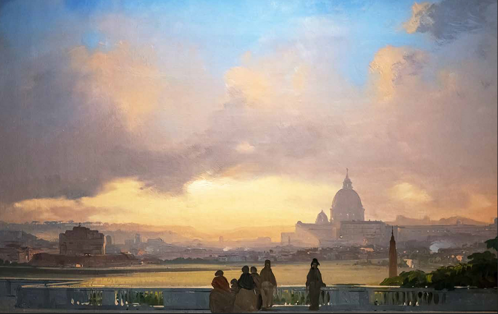 Rome, c’est l’expérience d’une palette particulière. Sous le ciel bleu clair du Latium, c’est un bain général d’ocre terre. Émergent de celui-ci des pains couleur de marbre blanc, monuments, bâtiments, sculptures et fontaines. Enfin, ponctuellement se dessinent les lignes ascendantes en vert profond des cyprès. Ces trois teintes fondamentales se retrouvent dans les œuvres présentées ici, notamment d’Horace Vernet, Corot, Canaletto, Claude Lorrain, Panini, Maurice Denis, Fragonard. Rome, ce sont aussi des formes pleines et douces, les ondulations de sa topographie. Neuf vagues qui soulèvent places et monuments. C’est aussi quelques grandes perspectives aboutissant à de merveilleux bâtiments en courbes que sont le Colisée, la cour du Vatican, le château Saint Ange, le Capitole, les colonnes du forum. Rien n’est ici à la Française, qui est un substitutif d’absolument raide et droit. Ici coule le Tibre, à l’italienne.