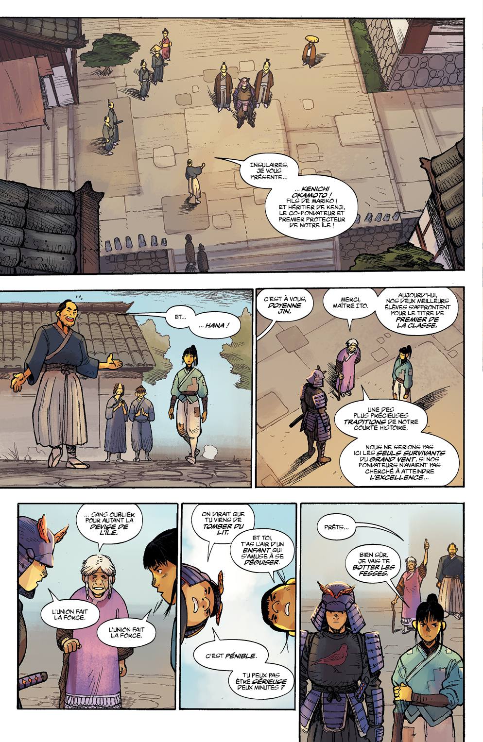 Avec un début somme toute assez tranquille, installé comme un prologue de rite initiatique, de fondements d’amitié (voire d’amour ?) sur fond de rivalité et d’inégalités de castes, Ronin Island, ne laissait pas envisager le souffle de l’Apocalypse qui allait s’abattre sur ce premier tome. Un général autoritaire mais en manque de recrues, une vieille doyenne pleine de sagesse mais déterminée à éradiquer les menaces, un prince immature mais orgueilleux, les personnages seront hauts en couleur et les épreuves vont s’enchaîner à un rythme effréné, dans une atmosphère toujours plus sombre. Alors attention, la violence reste relative, on est bien loin d’un Walking Dead ou d’un Kingdom, les revenants ayant un forme minérale assez rustique, pas vraiment terrifiante, plutôt façon Pirates des Caraïbes. Pourtant cette ambiance convient parfaitement à un jeune public, lassé par les contes de fées et avide d’aventures sans pour autant tomber dans les mutilations et horreurs réalistes.