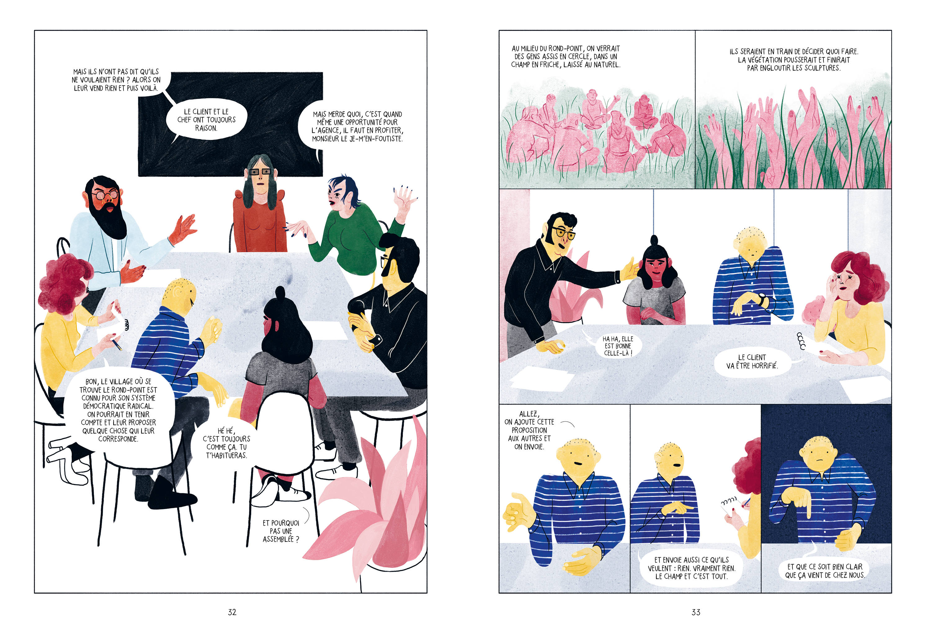 Cette trouvaille graphique est loin d’être la seule dans cet album. Candela Sierra en distille tout au long des pages, notamment pour illustrer le cœur d’activité de cette agence artistique qui ne s’appelle pas inopinément Rotunda : elle est spécialisée dans la conception de ronds-points. Rien que cette idée est saugrenue, mais elle illustre bien l’humour piquant de l’autrice. Chaque projet de rond-point fait l’objet de discussions entre les collaborateurs qui donnent lieu à des élucubrations parfois risibles ou absurdes et aboutissent à des résultats le plus souvent extravagants. Le motif du rond-point est également repris par l’autrice pour illustrer les titres de différents chapitres de l’album, autant de métaphores dessinées que le lecteur est invité à découvrir et à interpréter.