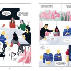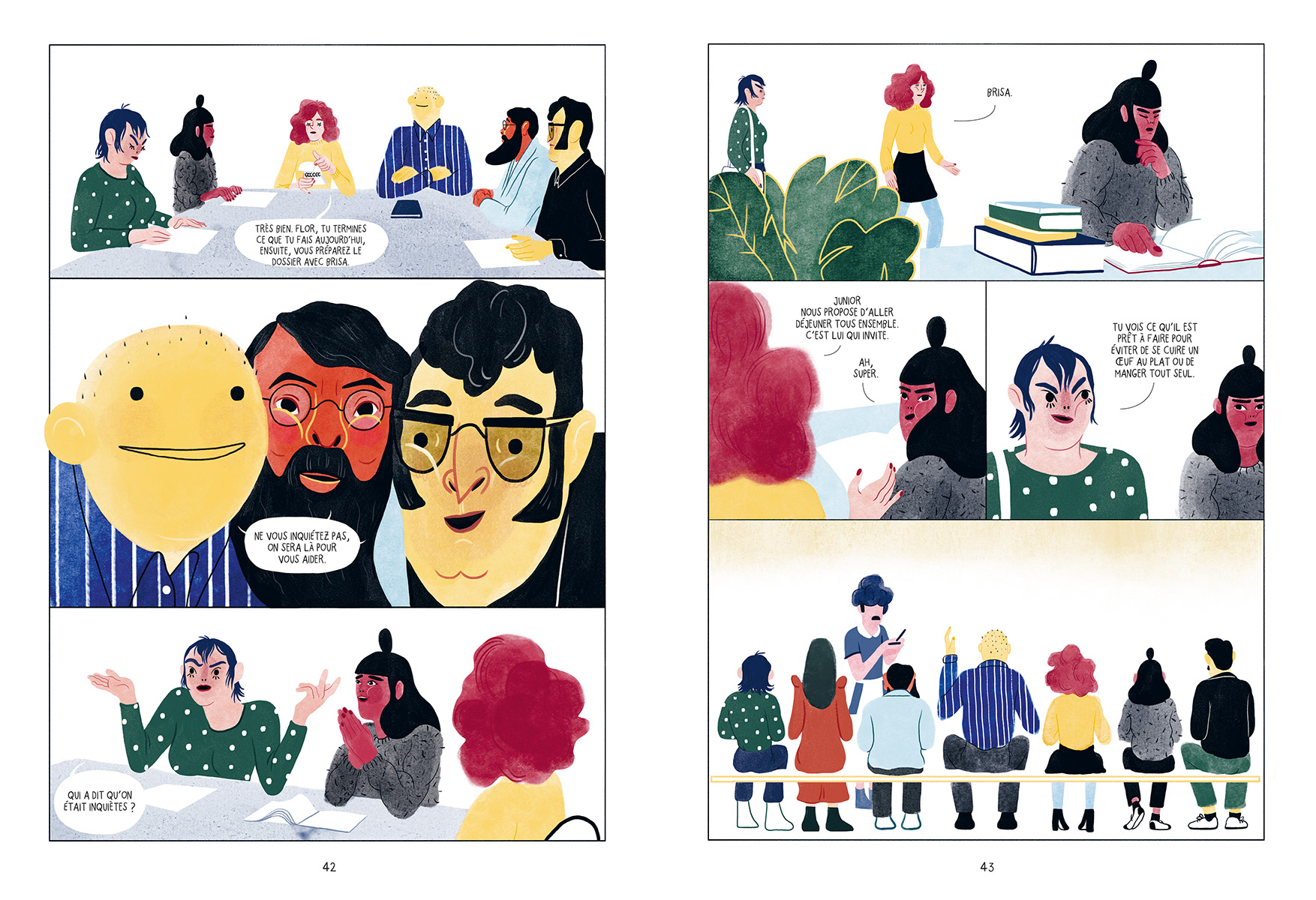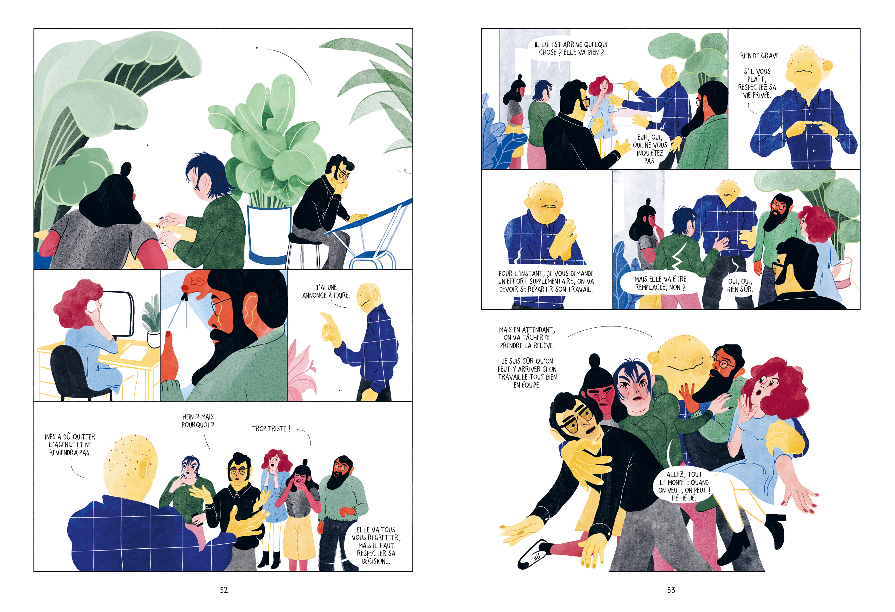 Pour les développer, elle sait habilement se servir des possibilités offertes par la forme bande dessinée. Par exemple, les plantes vertes occupent une place centrale dans la narration. Elles ne sont pas seulement des éléments de décor. Au fil des pages, nous découvrons que Junior, le directeur, cultive un goût prononcé pour la botanique. Un hobby qui devient de plus en plus encombrant dans les locaux. Plus l’environnement de travail au sein de l’agence se dégrade, plus les pièces de l’entreprise sont envahies de plantes vertes. Junior escompte-t-il maintenir ainsi, au vert les activités de son entreprise ? Se soucie-t-il vraiment du bien-être du personnel en installant à côté de leur bureau des pots de fleurs ? Est-ce pour l’autrice une façon malicieuse de questionner la notion d’environnement de travail, en illustrant cette expression de façon littérale mais détournée ?