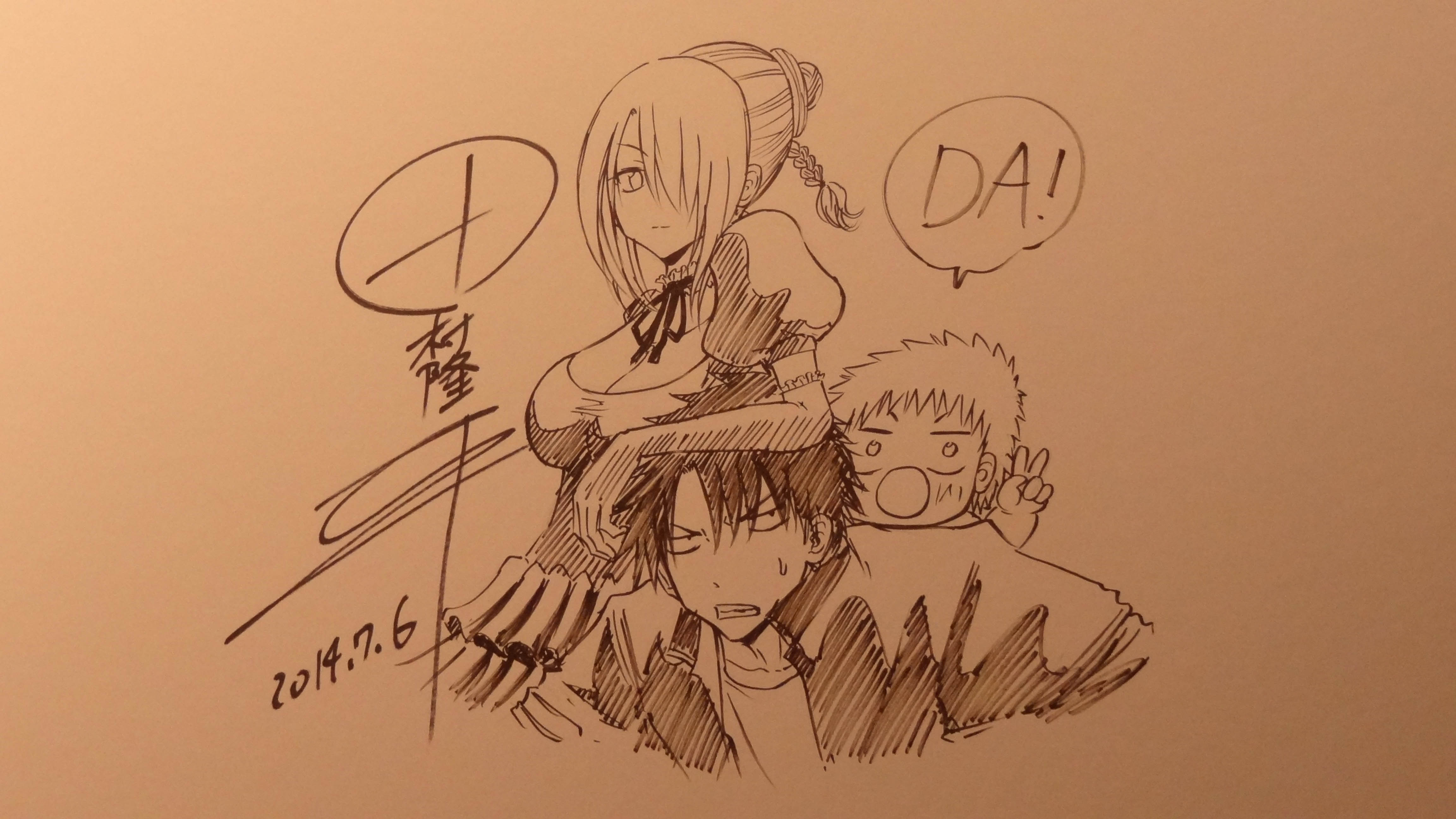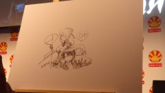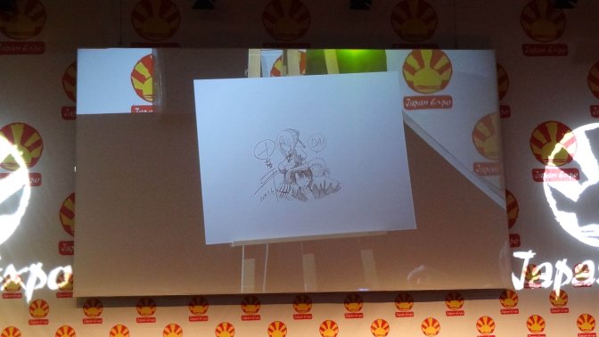 Après cet échange, le mangaka enchaîne en s’asseyant à une table à dessin pour réaliser devant nos yeux un petit croquis.