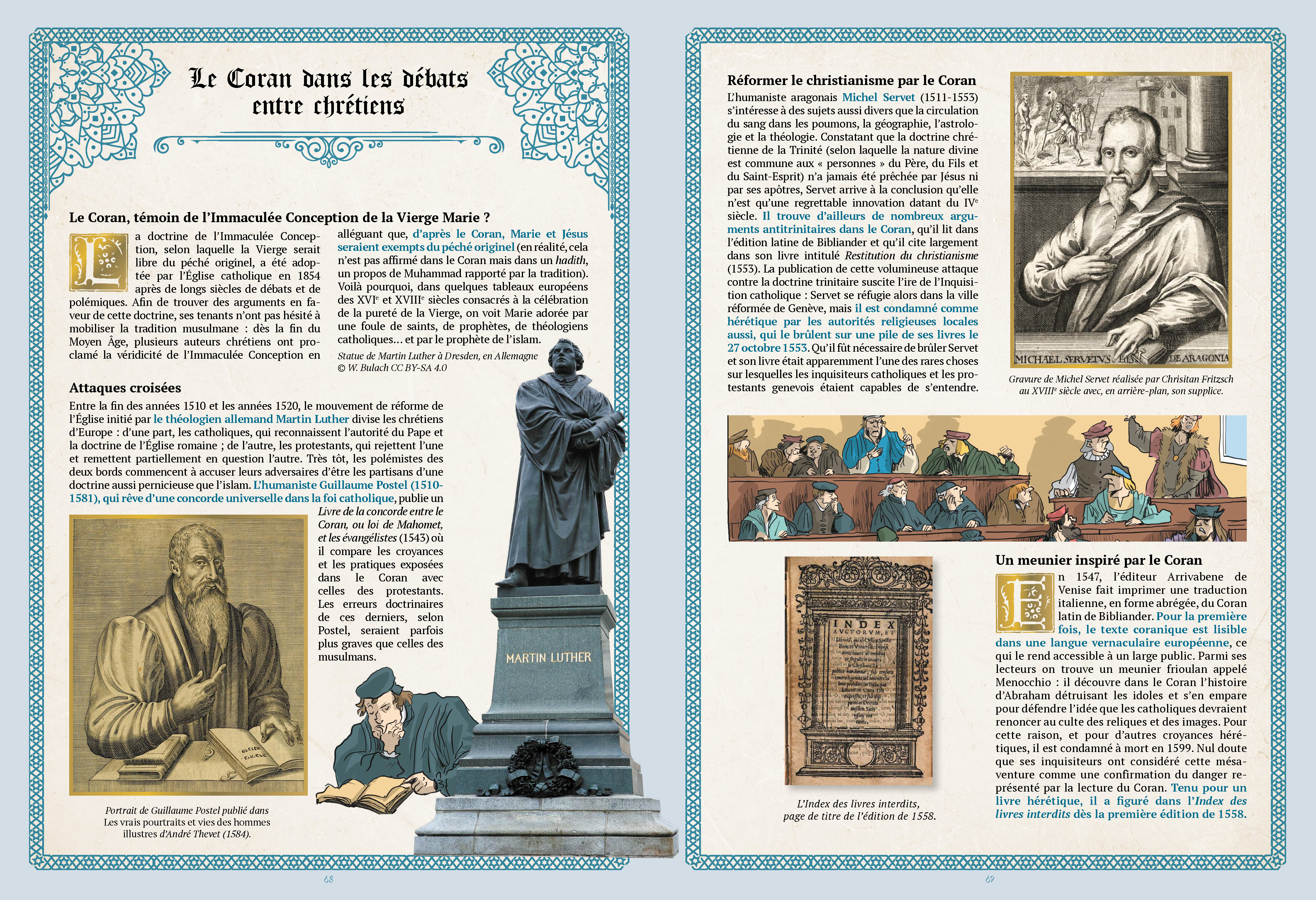 Ce docu-bd en est l’illustration. Il est le fruit du travail de médiation entrepris par une équipe de chercheurs rattachée à un programme de recherche international financé par l’Europe : « The European Qur’an (EuQu) ». Cet important projet scientifique dirigé par John Tolan, professeur d’histoire franco-américain, s’est donné pour mission d’étudier la contribution du Coran dans la formation de la diversité des identités culturelles, intellectuelles et religieuses de l’Europe médiévale et moderne. Cette bande dessinée est l’une des réalisations de ce programme scientifique. Elle a vocation à rendre accessible les premiers résultats des travaux menés à un public plus large que la seule communauté des chercheurs.
