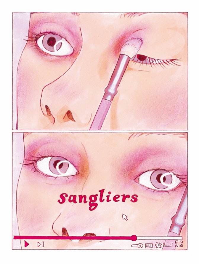 Critique : Après Astra Nova, album remarqué qui utilise la science-fiction pour parler de l’intime, Lisa Blumen retrouve les pieds sur terre avec Sangliers, dont le sujet est on ne peut plus contemporain. Fruit d’un travail de documentaire, Sangliers explore la face cachée du monde parfait de l’influence, où de jeunes femmes partagent avec enthousiasme leurs dernières découvertes et promeuvent des marques. Plutôt qu’un discours lénifiant sur les réseaux sociaux, Sangliers mobilise la fiction pour questionner ce monde aux pratiques opaques, en mettant habilement en scène la solitude d’une influenceuse qui dispose pourtant de milliers d’abonnés. L’album met également en évidence la toxicité de certaines pratiques sur les réseaux sociaux, et la transposition en ligne de la misogynie ordinaire – insultes sexistes, stalking – qui touchent l’héroïne de cette histoire.