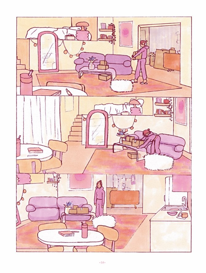 Sanglier captive par le sens de la mise en page de Lisa Blumen, qui alterne les plans et le découpage, scènes muettes et dialoguées, et file la parabole qui donne son titre à l’album. L’incipit u récit, qui présente Nina en train de se maquiller, s’avère particulièrement efficace pour nous faire entrer dans l’histoire. Le contraste entre les nuances de rose passées de l’album qui donne une atmosphère girly et la dureté de certaines scènes convainc tout particulièrement. On s’attache au personnage de Nina, qui nous est présentée sous toutes ses failles, et qui se confronte à une mécanique piégeuse qui est au cœur du récit.