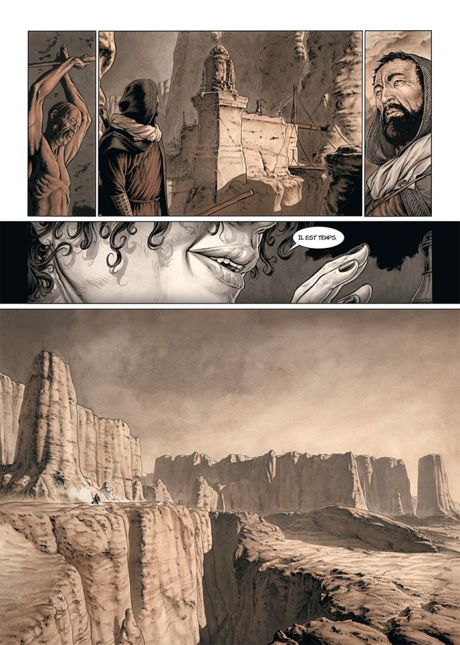 L’armée du roi Riben est épuisée, clairsemée et pourchassée par celle du Duc d’Omel, jusque dans le désert, aux confins de la passe de Shalin, qui abrite une communauté de renégats et de réprouvés. Ensemble, ils vont lutter pour l’honneur et avec un maigre espoir. Cette première partie du chapitre intitulé Shalin voit les héros de la série Servitude confronté aux hommes, aux éléments et aux sentiments tels que le désespoir et l’épuisement. Le monde de Servitude est âpre, dur et complexe. Si le scénario de ce nouveau se prête moins à une comparaison historique, à la différence des précédents, la touche de noblesse des cœurs mais pas des actes prend toujours. À l’instar de la saga Game of Thrones, il y a une touche de fantastique terrible, de médiéval rugueux voire même d’inceste décadent qui parcourt l’ensemble des tomes, créant un univers puissant et particulièrement captivant. Les héros vont et viennent, combattent et meurent, avec honneur ou non, dans une épopée qui ressemble à une guerre oubliée de notre Moyen-Âge. Dans ce tome, le siège s’inscrit dans cette lignée de réalisme teinté de magie, avec une place forte qui ne doit son nom qu’au désert qui la borde, et des problèmes qui vont de pair pour les assiégés comme pour les assiégeants. On se souvient alors que les auteurs apprécient particulièrement le fait de pouvoir décrire un univers cohérent à leur action, n’hésitant pas à expliquer les conditions de batailles, les forces en présence, tout en résumant les personnages principaux, à l’aide de cartes et chronologies fort utiles. Servitude a cette particularité, on sent que la série peut s’étendre très loin, très vite et très bien.