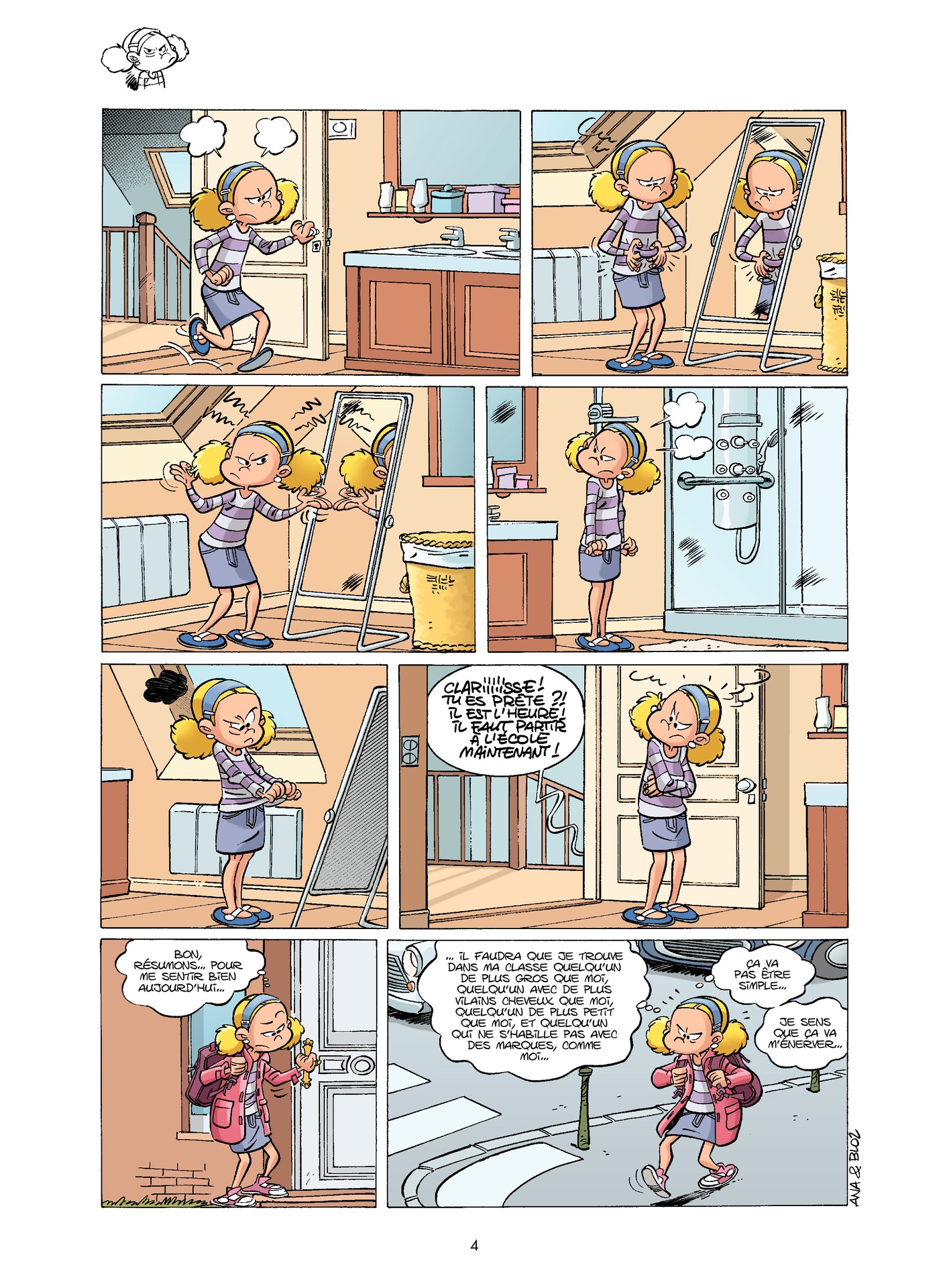 Un sujet si grave présenté sous le prisme du rire était un challenge difficile à relever. Les auteurs, Bloz et Ana, parviennent à conserver une touche sensible derrière le rire, sans doute car ils ont vécu ce douloureux problème de l’intérieur. L’héroïne de l’histoire, Emma, est une jeune fille qui n’a rien de particulier, aucun souci, aucune différence qui justifie qu’on la mette à l’écart. Une excellente idée puisque cela montre en premier lieu que la « différence » qui amène au rejet et au harcèlement est complètement subjective. Clarisse, la harceleuse, nous est présentée aussi dans sa famille et pas seulement comme "le méchant de l’histoire". On cerne doucement, au détour d’un gag, ses motivations, son cadre familial. Ce qui nous rappelle qu’il faut savoir comprendre l’autre pour résoudre les problèmes qu’il nous crée.