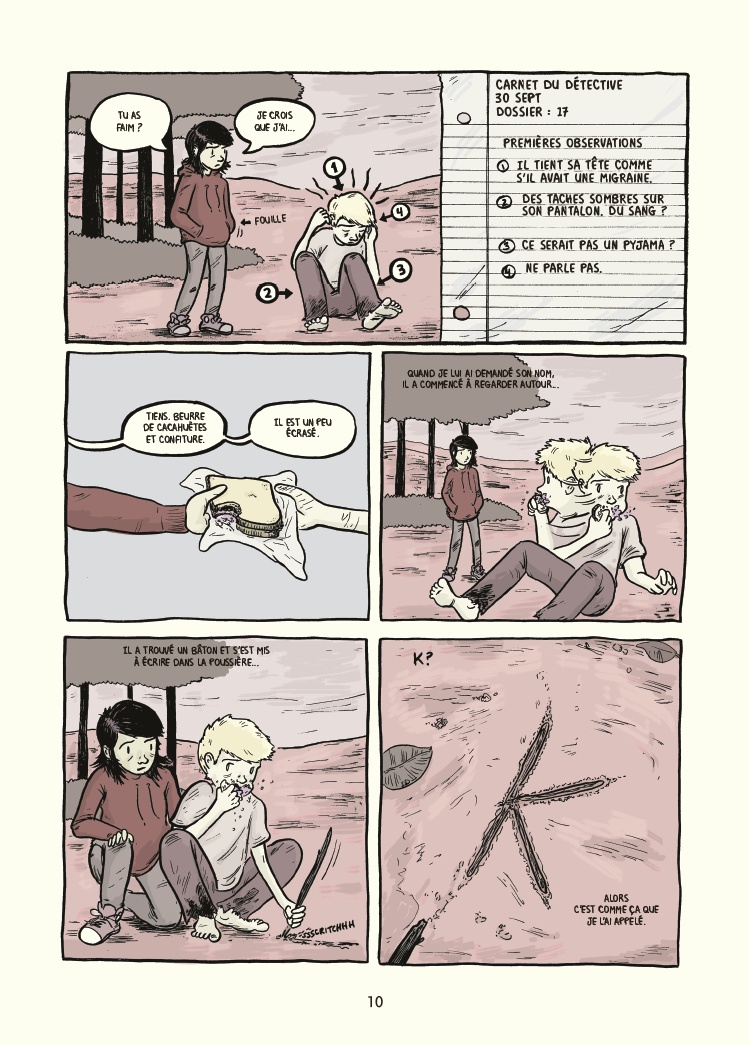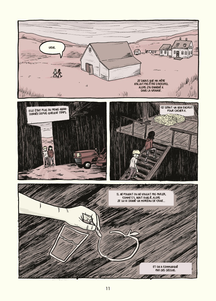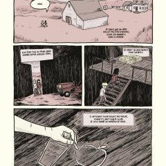 Pour accompagner ces thèmes complexes, un dessin clair et simple vient tapisser les planches comme un crépis lisse : les personnages y sont distincts, se détachant presque d’un décor qui porte des stigmates, des couleurs fades jusqu’aux arbres décharnés, où les crevasses sont légions et les rayons de soleil absents. La coulée noire est représente le pinacle graphique de l’album, au début risible, très vite trop visible, elle s’écoule et se greffe comme un parasite suintant, image de la sangsue que le symbiote de Marvel avait déjà visuellement bien éculé. Pourtant, grâce aux différents personnages, souvent sensibles et plus difficile d’accès qu’il n’y paraît, ce fil noir au lieu de rouge ne prend pas entièrement la place du dessin.