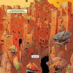 Philippe Pellet nous offre un graphisme à couper le souffle. Sur des grandes planches, des cités se dessinent, crénelées de pierre, avec ces frégates flottantes qui accostent. Une chaleur dure et sèche pèse sur chaque dessin au travers de ce ciel jaune, comme les dunes du désert.