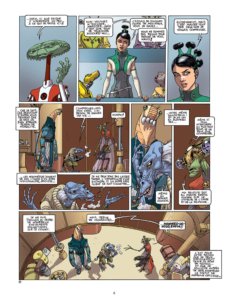 La seule révolution aurait pu provenir de la possible mort de Bobo, personnage acolyte récurrent et si sympathique de la saga, mais, et nous avons presque envie de dire malheureusement, celui-ci se retrouve finalement sauvé, comme a pu l’être Snivel avant lui. Non, les amis seront encore là, pour épauler encore et toujours Nävis, qui aura donc l’occasion d’écrire un peu plus sa légende. Car Psycholocauste, s’il n’appelle pas de suite immédiate pour son histoire, fait figure de véritable best of, au sens où tous les ingrédients qui ont marqué Sillage semblent avoir été réunis pour faire un album héritage. Comme s’il allait être difficile de relancer la machine Sillage après une telle crise et tant d’efforts réunis. Mais laissons faire Morvan et Buchet, car c’est la leur grande qualité, savoir rebondir sur des côtés secondaires de l’histoire, inattendus mais toujours captivants.
