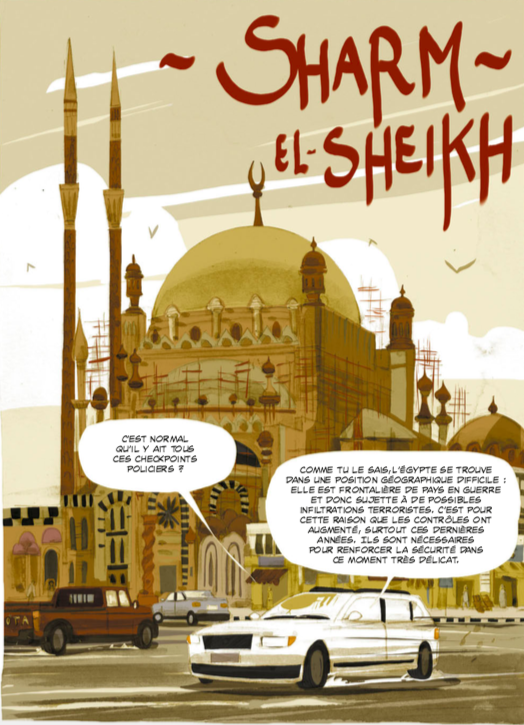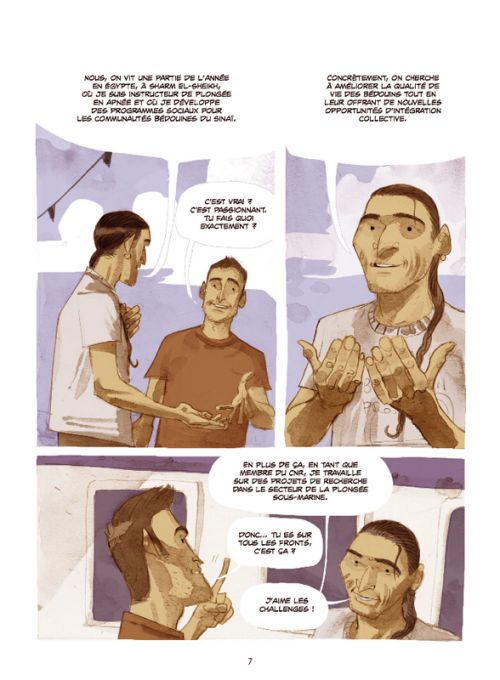 Résumé : Le dessinateur Lelio Bonaccorso rencontre en 2009 Fabio Brucini, instructeur de plongée italien dans le Sinaï et spécialiste du désert, où il possède de nombreux contacts chez les Bédouins. Fasciné par les récits de celui qui devient son ami, Lelio Bonaccorso décide de partir avec lui à la rencontre des « Bedu » – comme ils se définissent eux-mêmes – du Sinaï pour comprendre leur culture et la partager dans un récit en bande dessinée. De la station balnéaire Sharm El-Sheikh délaissée par les touristes européens depuis l’émergence du terrorisme au Monastère Sainte-Catherine, les deux compères dévoilent, à travers des échanges avec certaines figures des communautés bédouines, la philosophie et les traits de leur culture, et leurs confrontations avec la modernité occidentale.