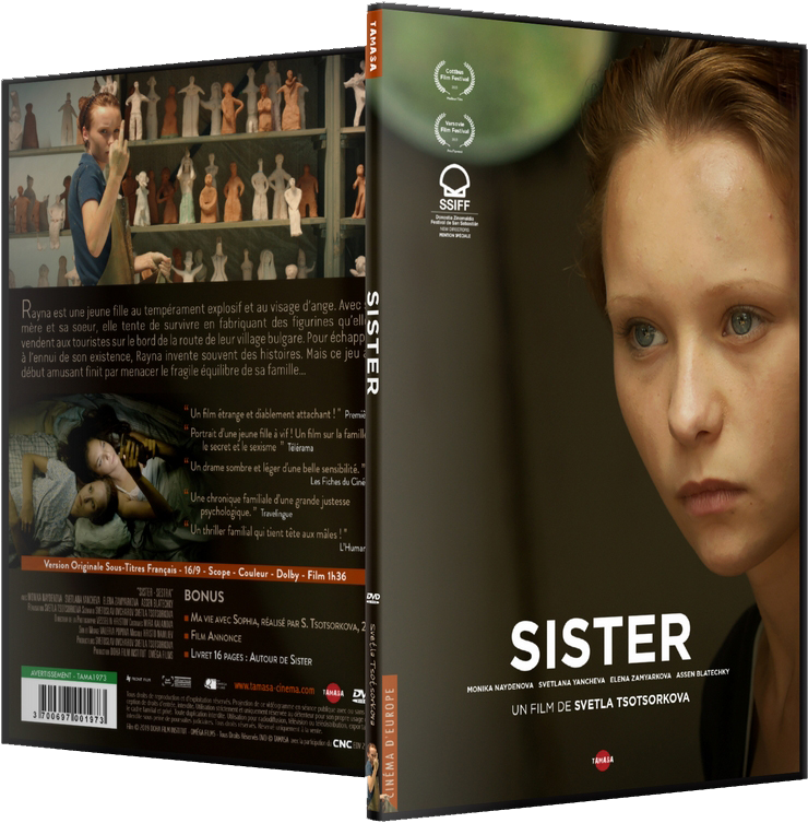 Le DVD, édité en digipack par Tamasa, est accompagné d’’un livret qui propose deux interviews : celle de la réalisatrice et celle de la jeune actrice principale, Monika Naydenova. Sur le DVD proprement dit, outre le film, uniquement présenté en version originale sous-titrées, dont l’image est extrêmement bien restituée, on trouve en bonus : -la bande-annonce, - "Ma vie avec Sofia" ("Zhivot sas Sofia"), le premier film de la réalisatrice, un court-métrage de vingt minutes minutes datant de 2004. Cette œuvre a comme interprète principale, Sveltana Yancheva, qui sera la mère de "Sister". Dans la campagne bulgare, Sofia, une femme dont le mari s’est enfui, s’est reconvertie en coiffeuse. Son voisin, déjà amoureux d’elle avant son mariage, sera son seul soutien contre la folie qui gagne Sofia, écrivant tous les jours à son mari, persuadée de son retour. Le contexte social est celui que l’on retrouvera dans "Sister" : la campagne pauvre bulgare, des gens frustres qui s’échappent par le rêve, n’arrivent pas à exprimer leurs sentiments et sont capables de gestes violents irréversibles.