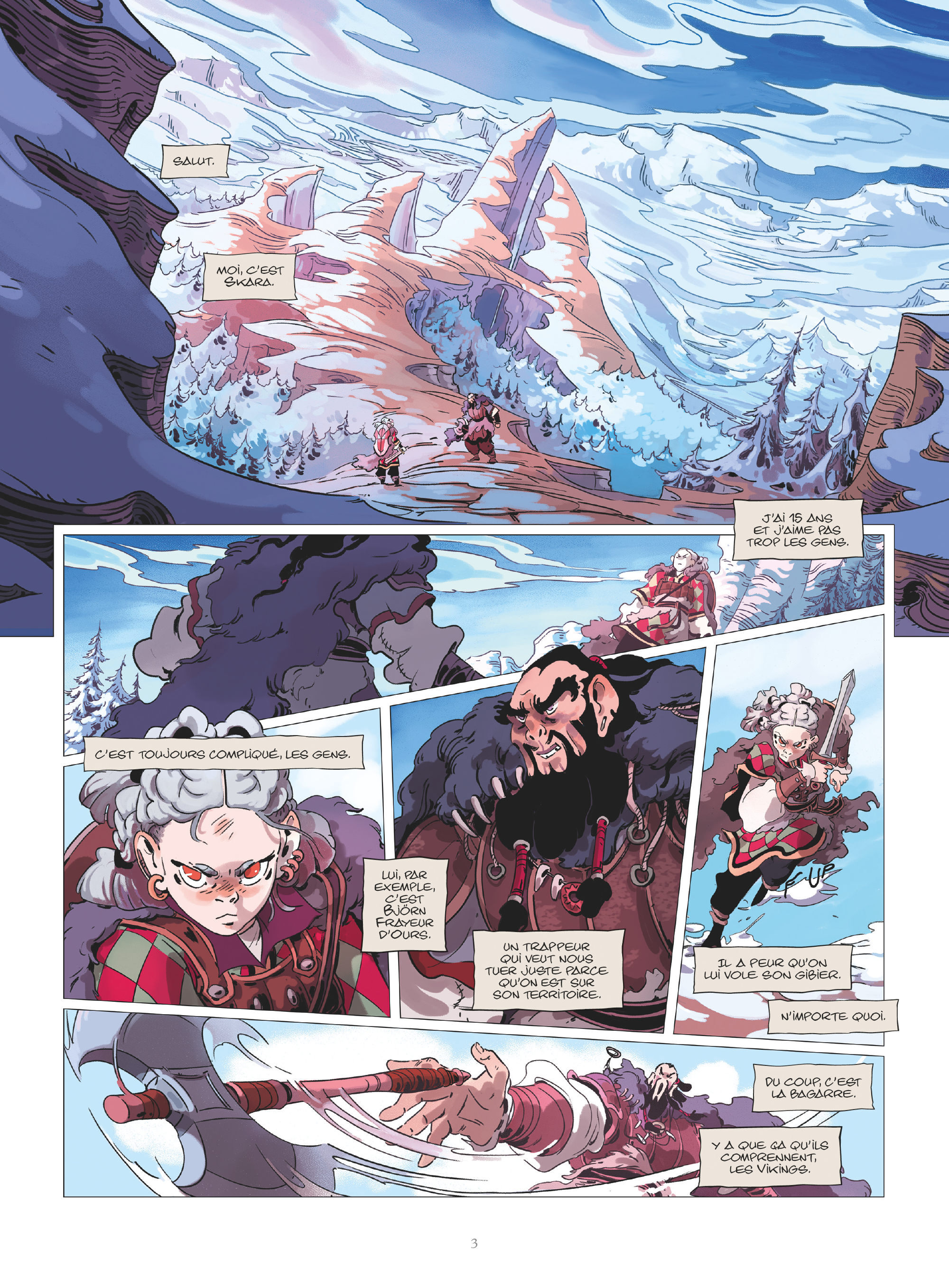 Avec humour mais tout en conservant la dureté des légendes nordiques, ce côté dark que Jérôme Le Gris sait faire, le scénariste nous propose une quête initiatique avec des héroïnes badass, Skara et Rùna, et une prêtre maladroit, Bojan. Un trio que nous avons pris plaisir à découvrir et à suivre ! La dynamique de ce trio, bien qu’assez classique, fonctionne très bien et nous sommes rapidement attachés à eux et à leur quête...