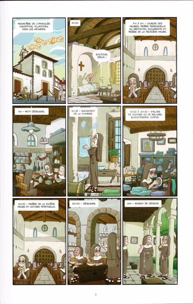 Résumé : {Sœur Calvaire} commence avec la routine de vie du monastère de l’immaculée conception dans les Asturies espagnoles. Survient une séance d’exorcisme qui échoue : sœur Justine se réveille en sursaut, ce n’était qu’un rêve qu’elle consigne minutieusement avant de reprendre son train-train quotidien. Quand soudain le crucifix qu’elle porte en collier se met à biper, le signal d’un appel curieux qui la précipite dans un cimetière abandonné : un démon de niveau trois a été repéré ! Sœur Justine, alias « Sœur Calvaire 24 », doit intervenir...