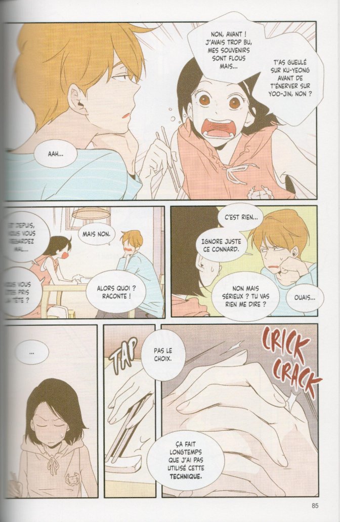 Critique : Prendre le contrepied d’une idée reçue est souvent un bon moyen de développer une histoire, même si c’est un chemin déjà emprunté par d’autres auteurs auparavant. L’idée de détailler la relation d’amitié entre un jeune garçon et une jeune fille fait office de topos largement répandu dans toutes les œuvres destinés aux adolescents, mais Something About Us semble vouloir aller jusqu’à son bout pour légitimer ce que d’ailleurs l’ensemble des autres personnages, les deux héros mis à part, semble croire : il n’y a pas d’amitié forte possible, car celle-ci cédera logiquement face aux sentiments. Inutile d’aller au-delà de la moitié du premier tome pour comprendre que cette série va craquer également, mais, et c’est un grand mais, cette histoire propose un développement si fin, des pensées si bien amenées, des situations si ténues, que l’on se plaît à oublier ce postulat de départ pour ne bientôt que voir l’aboutissement de ces multiples fils. Ainsi, un personnage secondaire, cette amie de l’héroïne malmenée par un petit ami au départ simplement égoïste, mais qui va subir des relations, apporte une complexité et une profondeur plutôt inattendues, et cet écart de la narration enrichit considérablement l’ensemble.