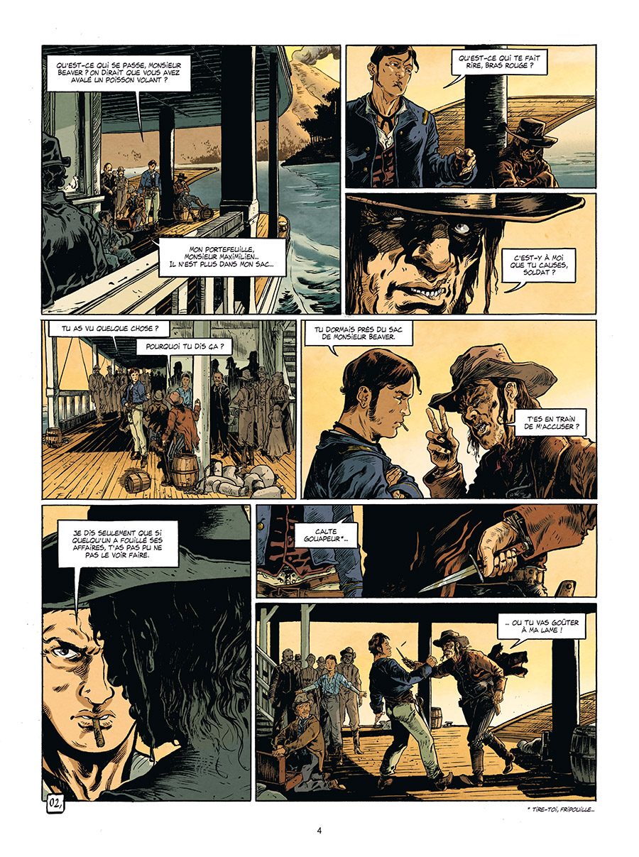 Le dessin est propre, sans fioritures, avec une Californie sale, ocre et poussiéreuse, des personnages en haillons davantage qu’en uniformes, mais un souci particulier pour les armes. Là encore, force historique oblige, les colts sont impeccables, et les décors inédits, avec ce San Francisco bien loin des standards de la baie que l’on connaît maintenant. L’angle français permet de voyager entre Paris et San Francisco, mais aussi de montrer l’enchevêtrement de nationalités qui cohabitent à ce moment là, et donc de rendre de manière fidèle ce melting pot de misère et d’espoir.