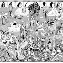 Médiévales , édité chez Ion en 2012 se présente sous la forme d’une pochette contenant cinq « grandes images (50 sur 60 cm) à déplier, regarder à la loupe pendant des heures. » Une invitation à l’attention, à l’exploration de ces dessins foisonnants de personnages tirés d’un imagier historique, mythologique, cosmogonique.