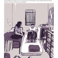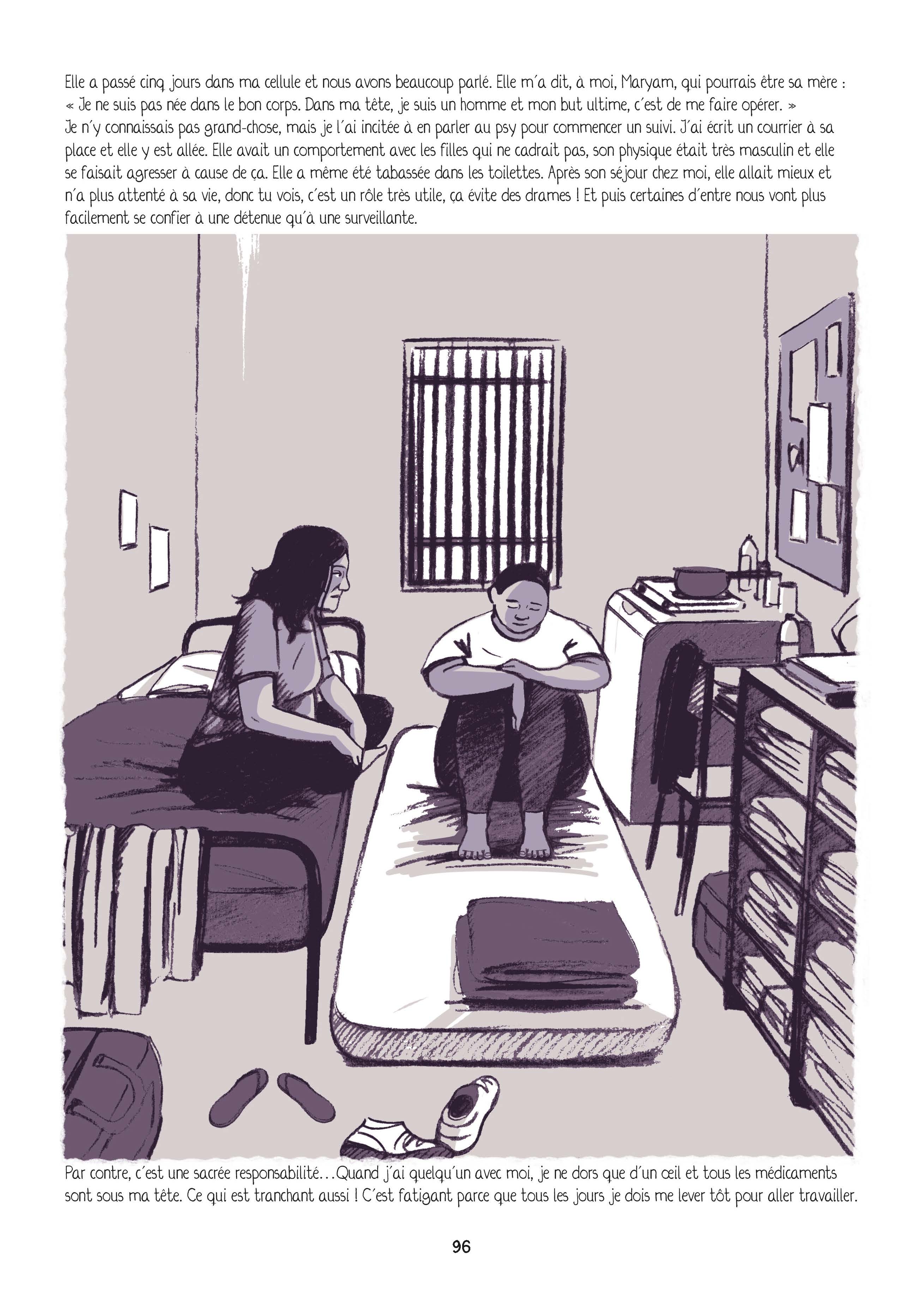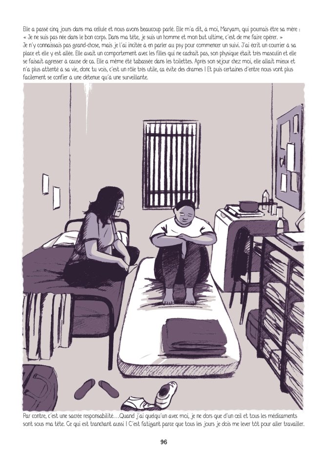 Ce livre est aussi un témoignage fort de sororité. Entre détenues des liens se créent, soutien et solidarité sont présents mais cet album ne dissimule pas non plus les mesquineries et les coups bas qui peuvent exister entre femmes. Le rôle des surveillantes de prison est aussi mis en lumière, leurs questionnement professionnels sur leurs missions de « garde » et de « réinsertion » (p.62 ), dans un contexte souvent marqué par une manque de moyens publics et de surpopulation carcérale. La vie en prison ressemble à la vie hors de prison à l’image de cette réplique d’une surveillante lors d’un échange avec ses collègues à une pause-café : « Comme dans la vraie vie, y a des affinités avec certaines et pas avec d’autres » (p.64).