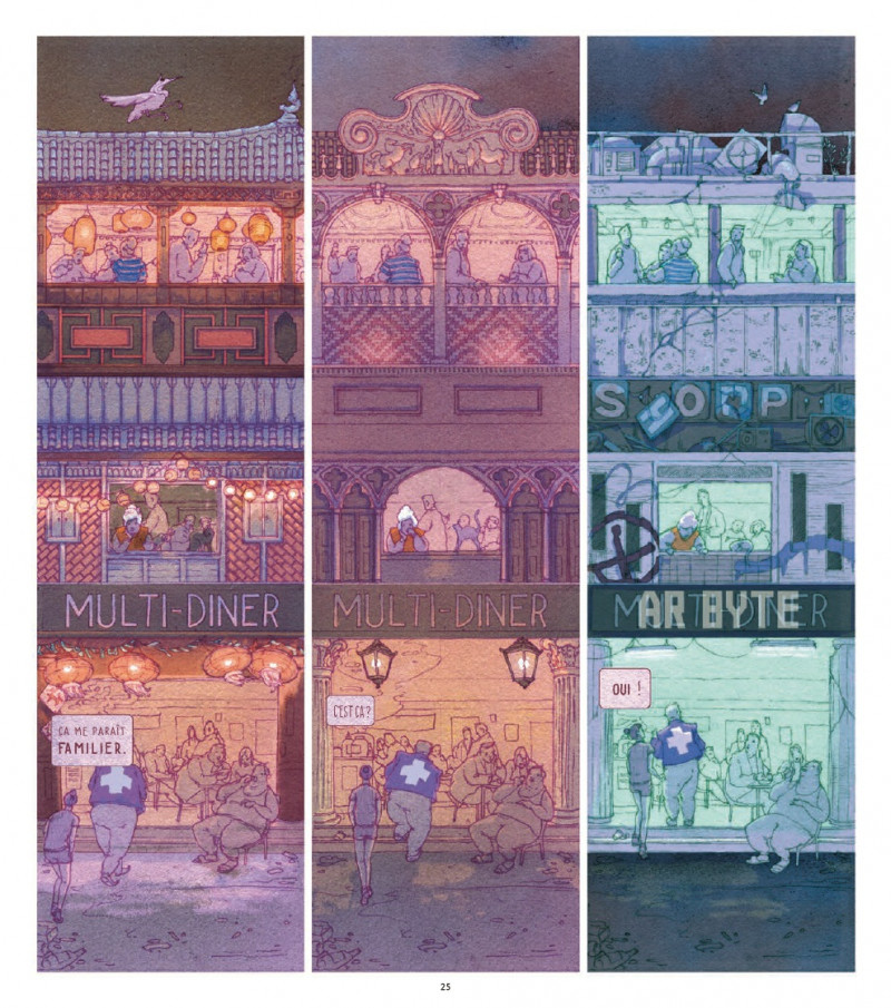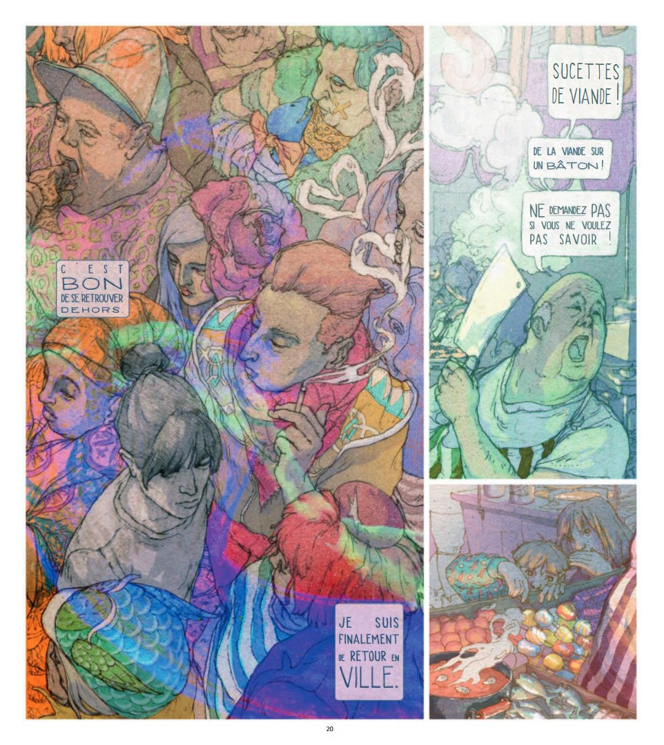 Revenons à la claque graphique, puisque le scénario, qui mêle rêve, virtuel et un peu de réalité tout de même, est déjà à la hauteur d’un bon Orwell, mais ce que l’on retient, ce sont les entrelacs du dessin, qui jongle entre les volontés, choisissant tantôt un style éthéré comme un rêve éveillé et diffus, tantôt l’interface précise d’un ordinateur ou smartphone amélioré, intégré à la rétine… Malgré cela, le style est installé, faisant baigner dans toute cette œuvre au format imposant et carré une lumière étrange, comme une aube sale, que des yeux fatigués ou mal réveillés auraient à scruter, à l’image du ressenti de l’héroïne. Par la suite, cette aube laisse place à un monde qui alterne couleurs trop présentes du réseau et gris trop terne du béton de la réalité.